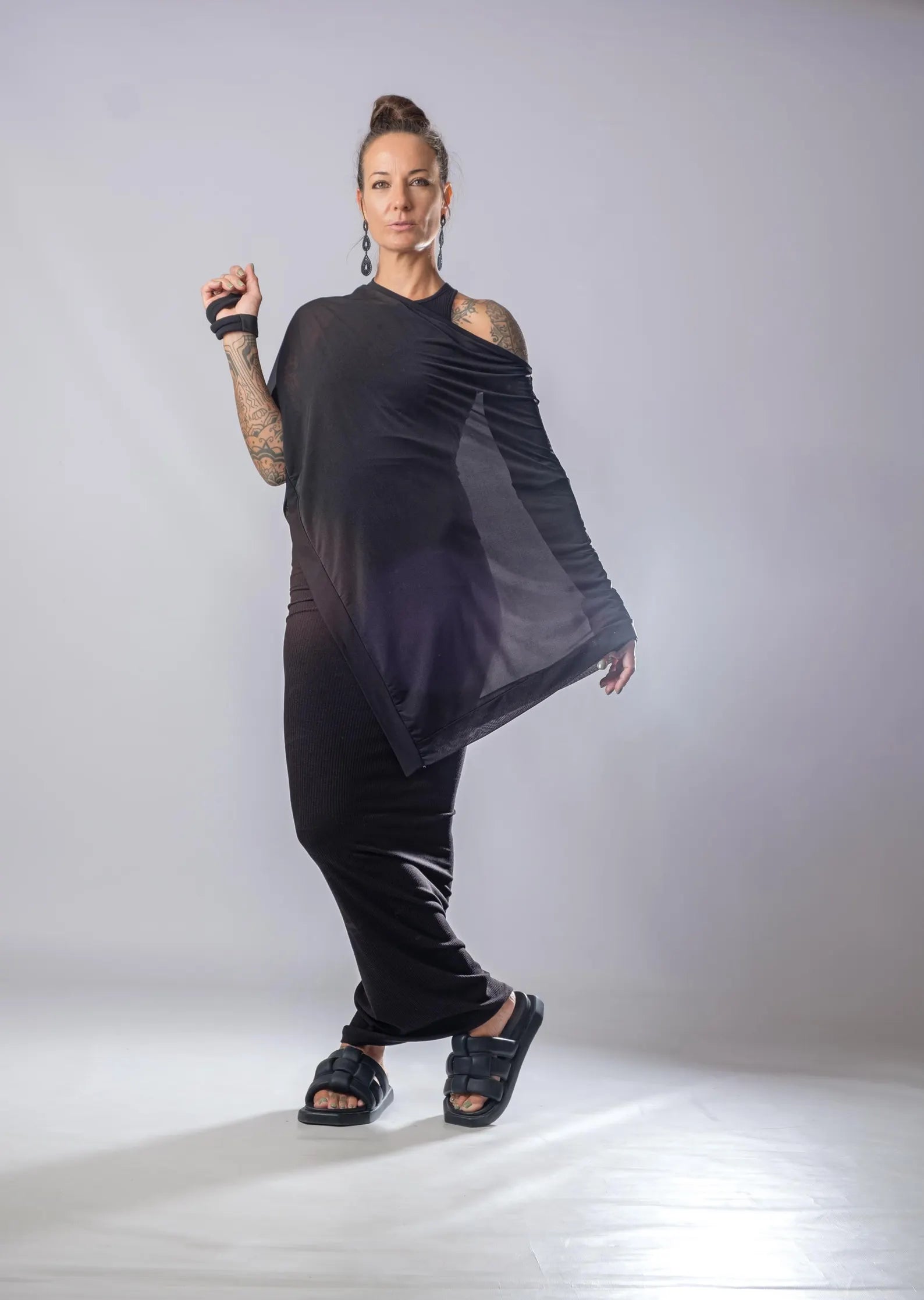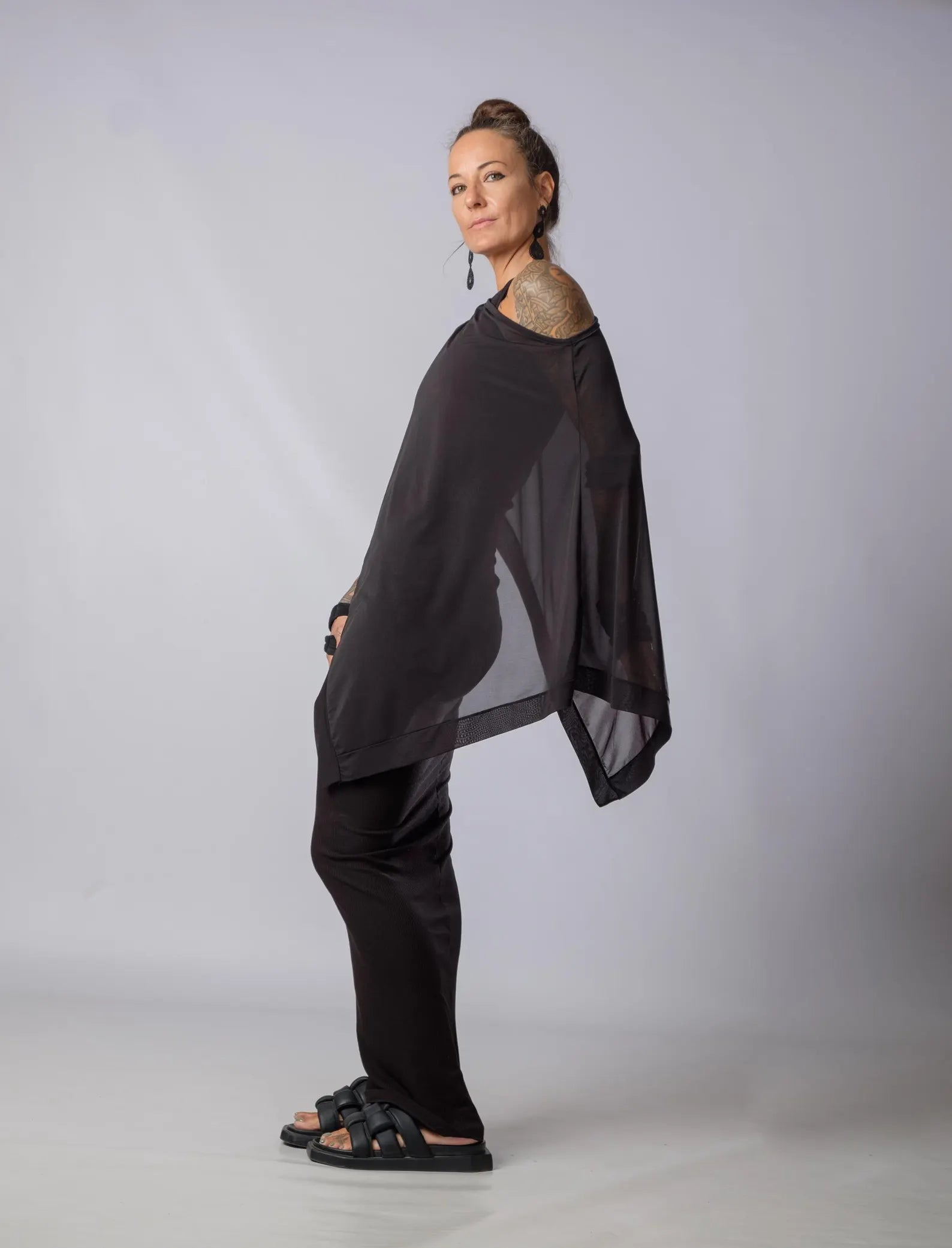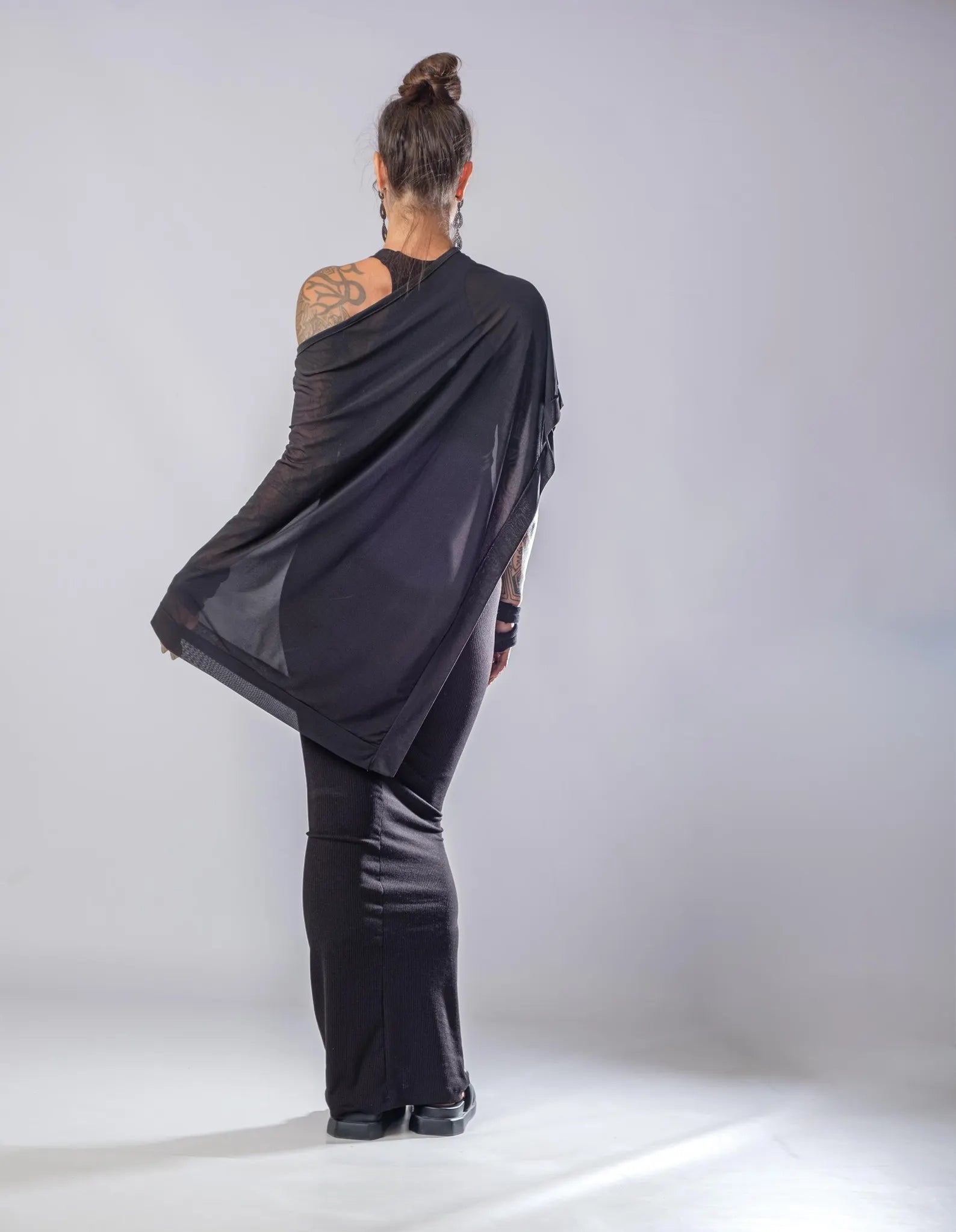 Step into effortless elegance with our Extravagant Black Sheer Cape Tunic—a statement-making masterpiece designed for those who love to stand out. Crafted from a mesmerizing sheer mesh fabric, this asymmetric tunic drapes beautifully over your silhouette, blending sensuality with a hint of mystery.