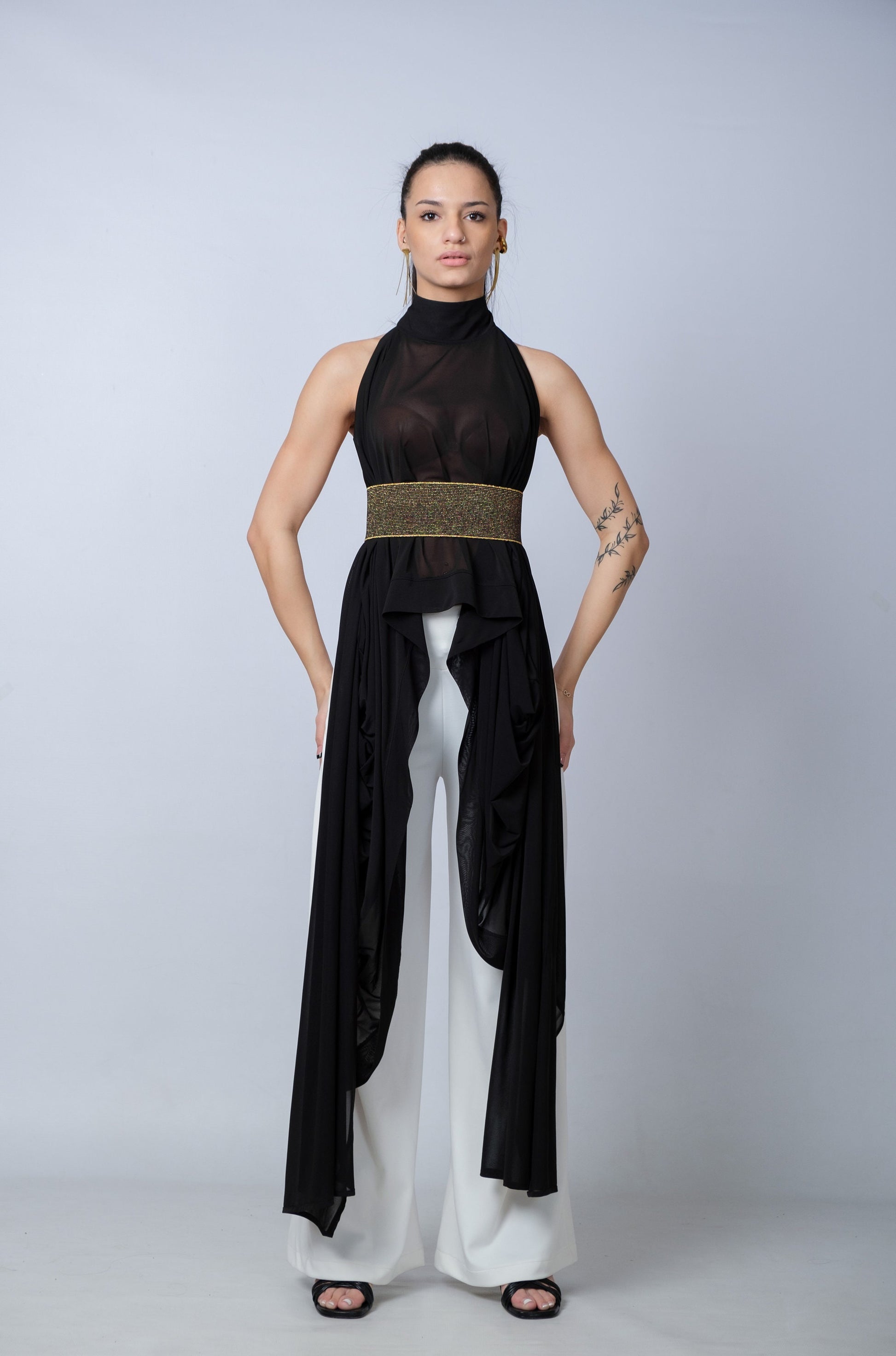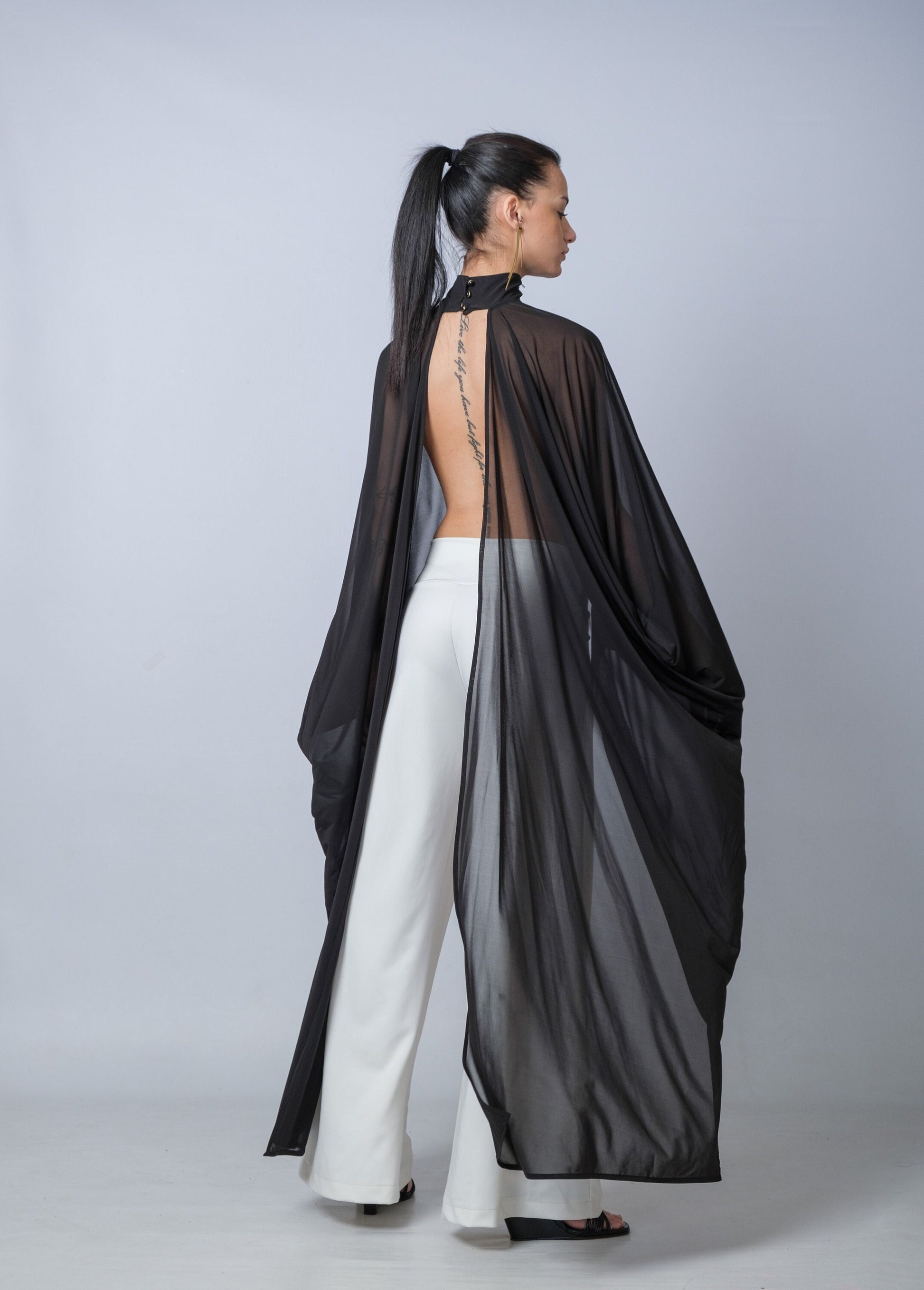 Indulge in opulence with our Extravagant Black Sheer Cape Tunic, designed to captivate and make a statement. This exquisite garment embodies sophistication and elegance, making it a must-have for special occasions or those moments when you want to stand out.