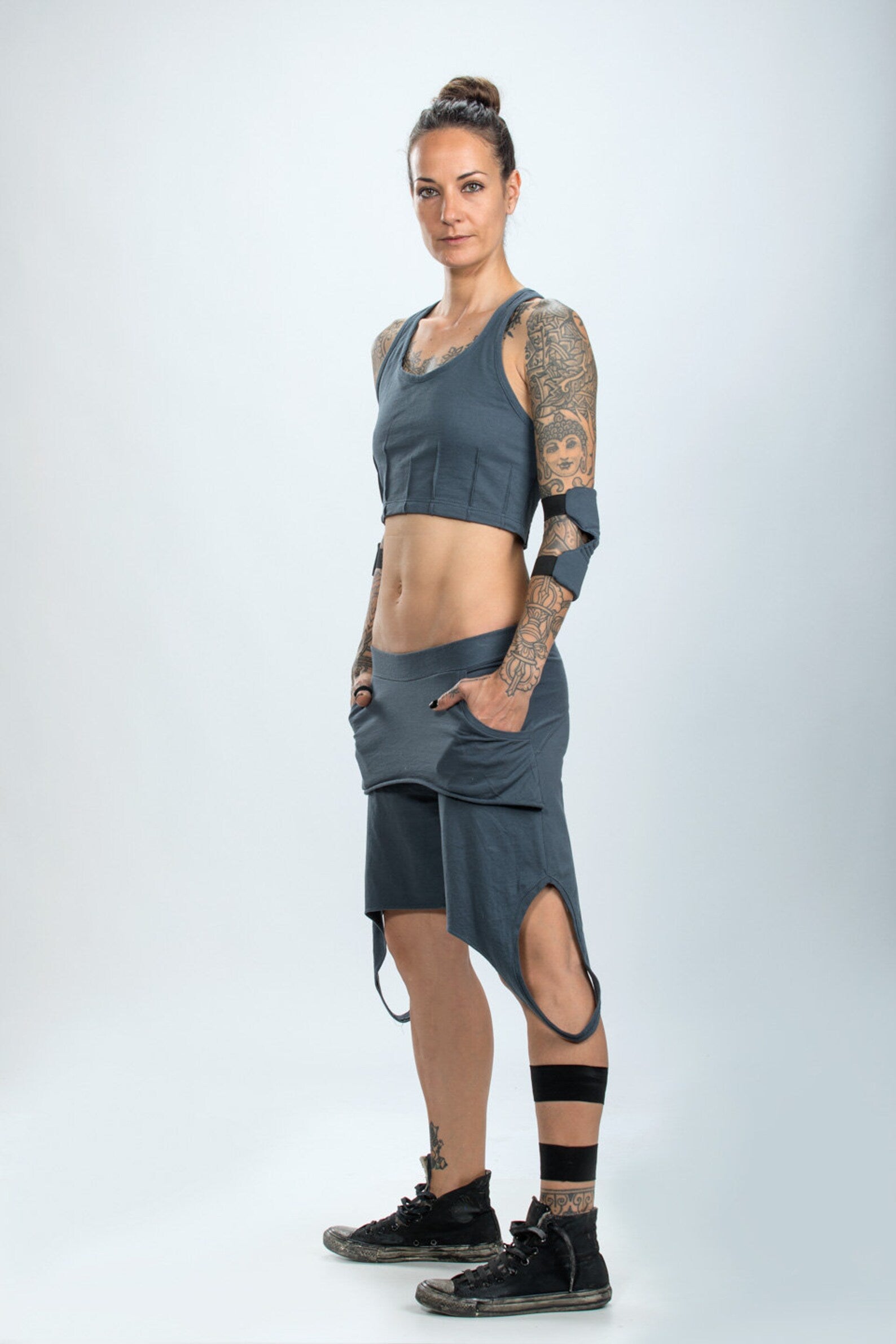 When comfort meets style, this design is the result! These cargo-style, asymmetric cotton shorts feature an elastic waistband for a low-rise, loose fit. With pockets and an overlayed skirt, the short skirt continues at the back for added flair. The asymmetrical hem on both sides adds an edgy touch, making these the perfect shorts to feel comfortable while still looking stylish and bold!