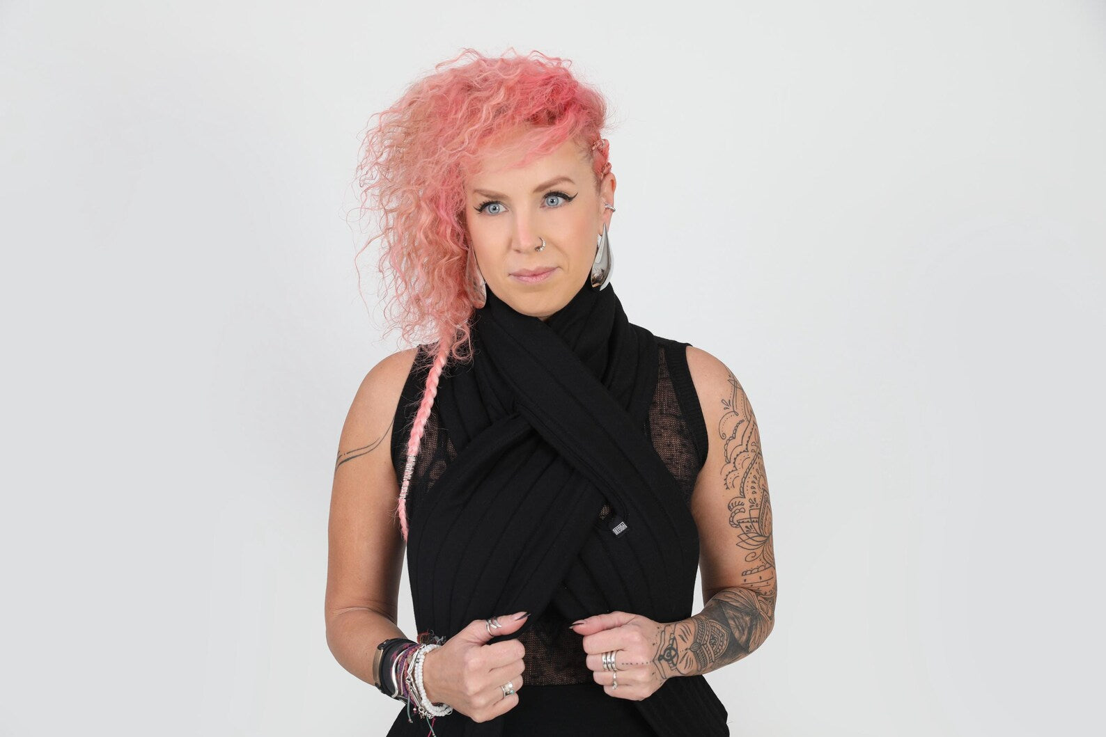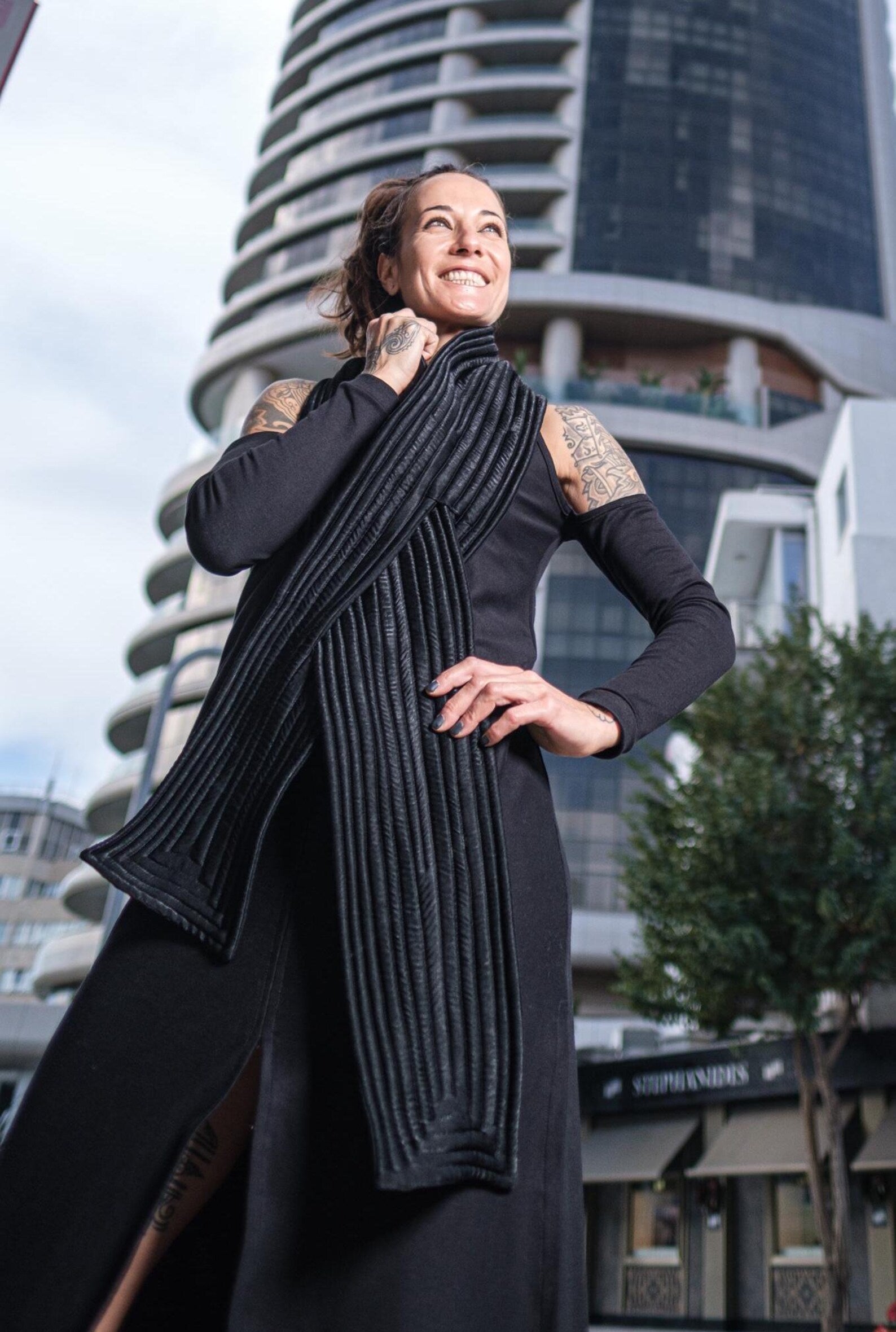 Stay warm and stylish with this long puffer scarf—a must-have accessory for goth, techwear, and festival fashion lovers. Crafted from soft cotton, this oversized unisex shawl offers both comfort and versatility, doubling as a cozy blanket scarf perfect for layering during chilly weather. Whether you're at Burning Man, attending a rave, or adding an edgy twist to your streetwear, this futuristic wrap will make a bold statement with any outfit.