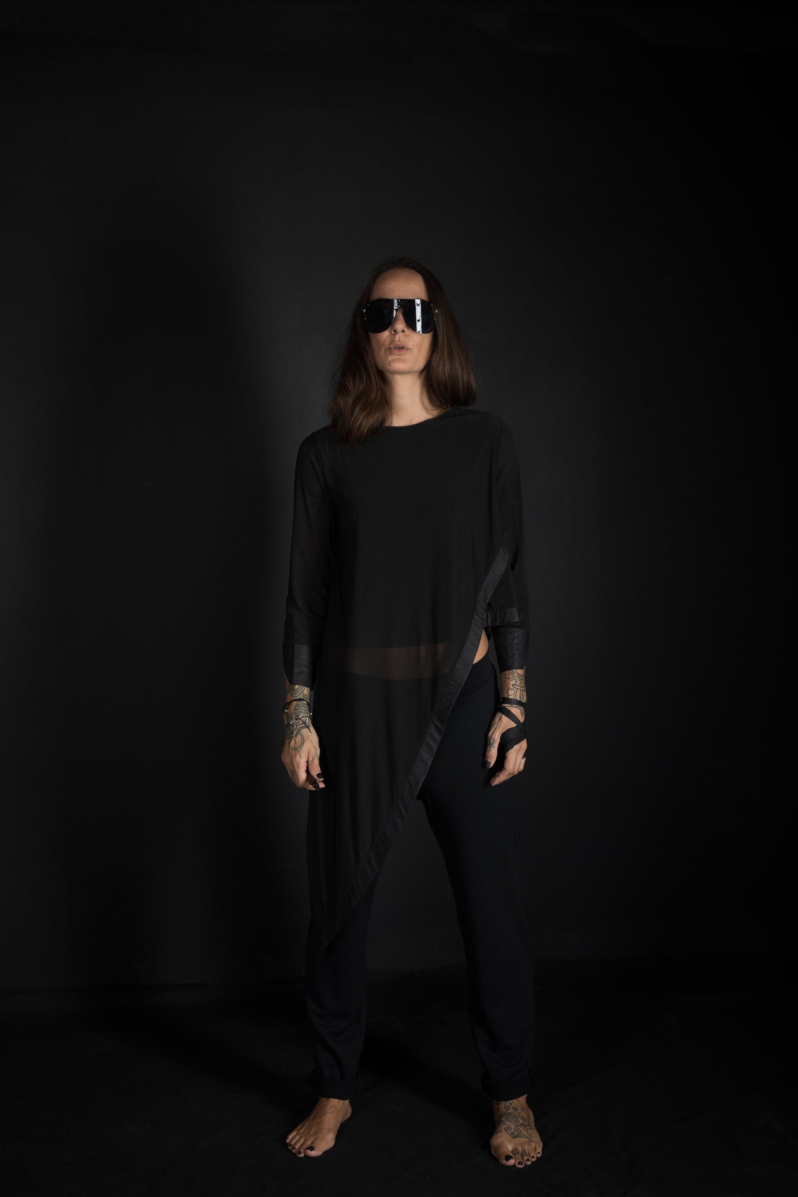This is our absolute favorite design – it's the perfect blend of hardcore and sexy. With an asymmetric cut, fake leather details, and 3/4 sleeves, this piece exudes confidence and allure. The see-through material adds a daring touch, while maintaining a feminine edge. What you see in the picture is exactly what you'll get—bold, beautiful, and undeniably stylish. This design is for the woman who isn't afraid to stand out and make a statement.