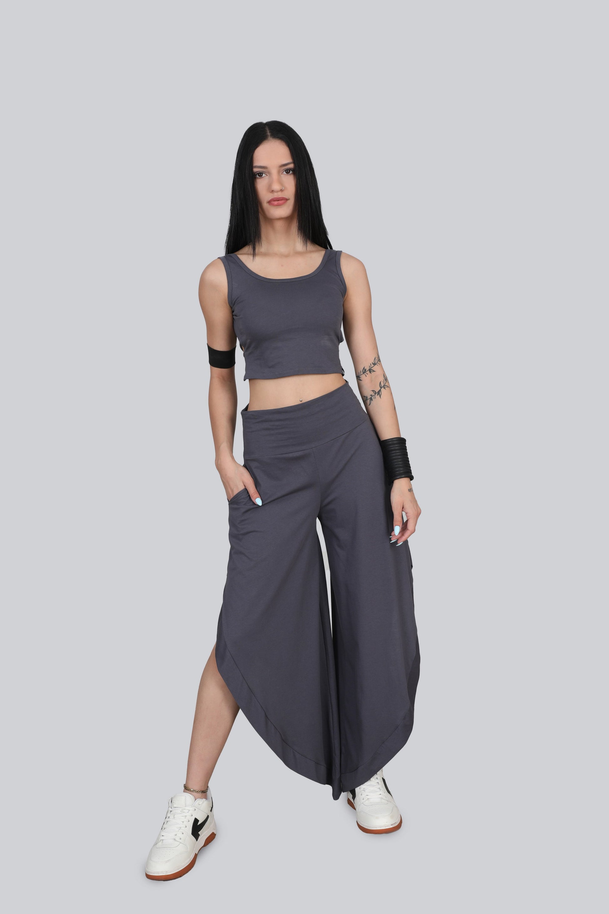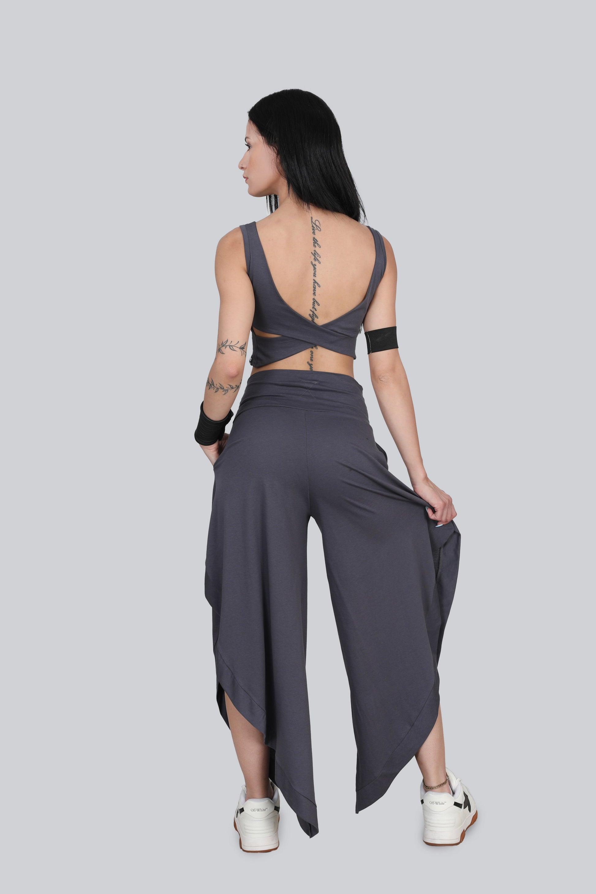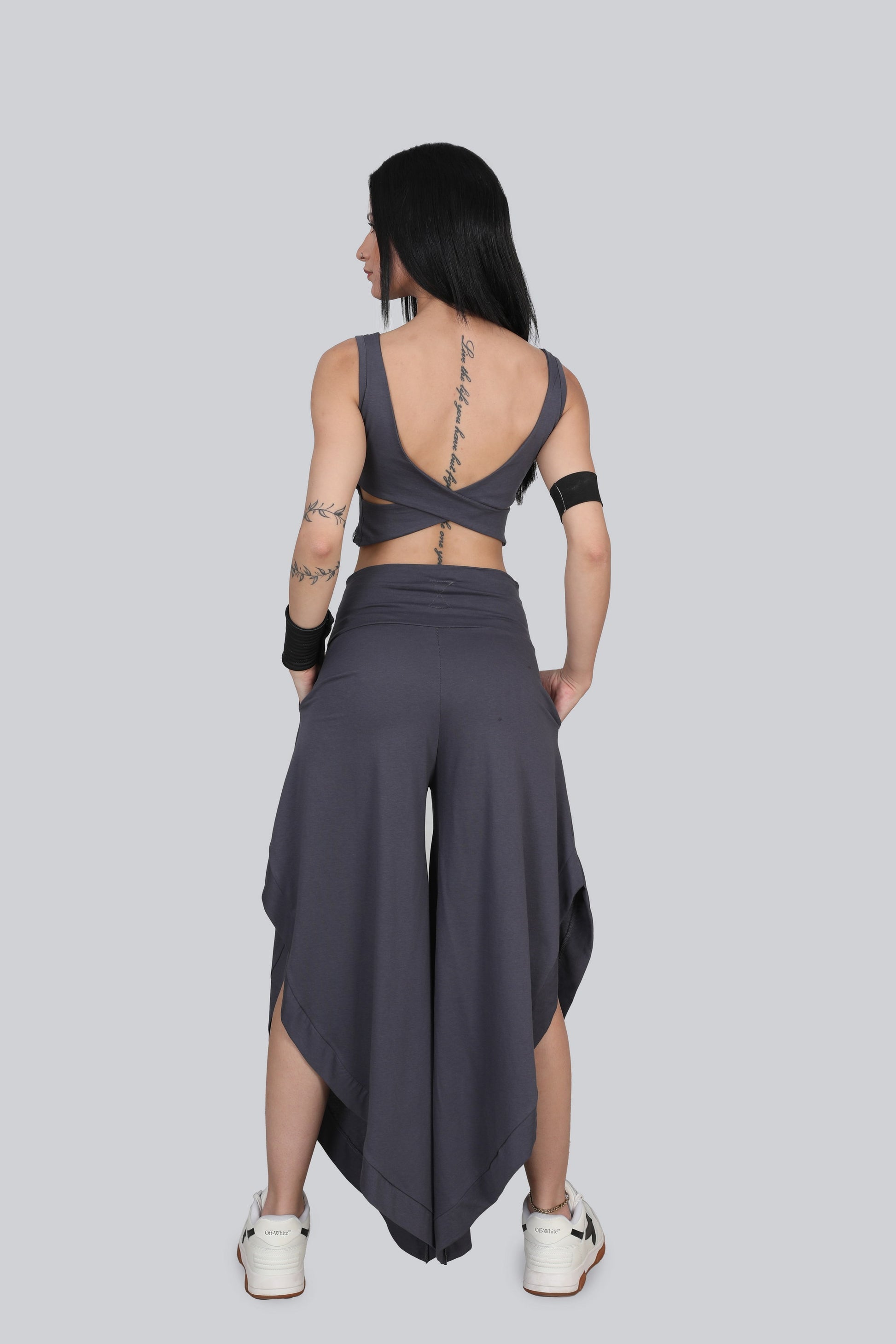 Step into effortless cool with the Edgewalker Set, designed to blur the lines between bold and comfortable. This versatile two-piece features wide-leg cotton pants with daring high side splits and deep pockets, paired with a backless, crossed-strap top that brings subtle edge to soft basics.