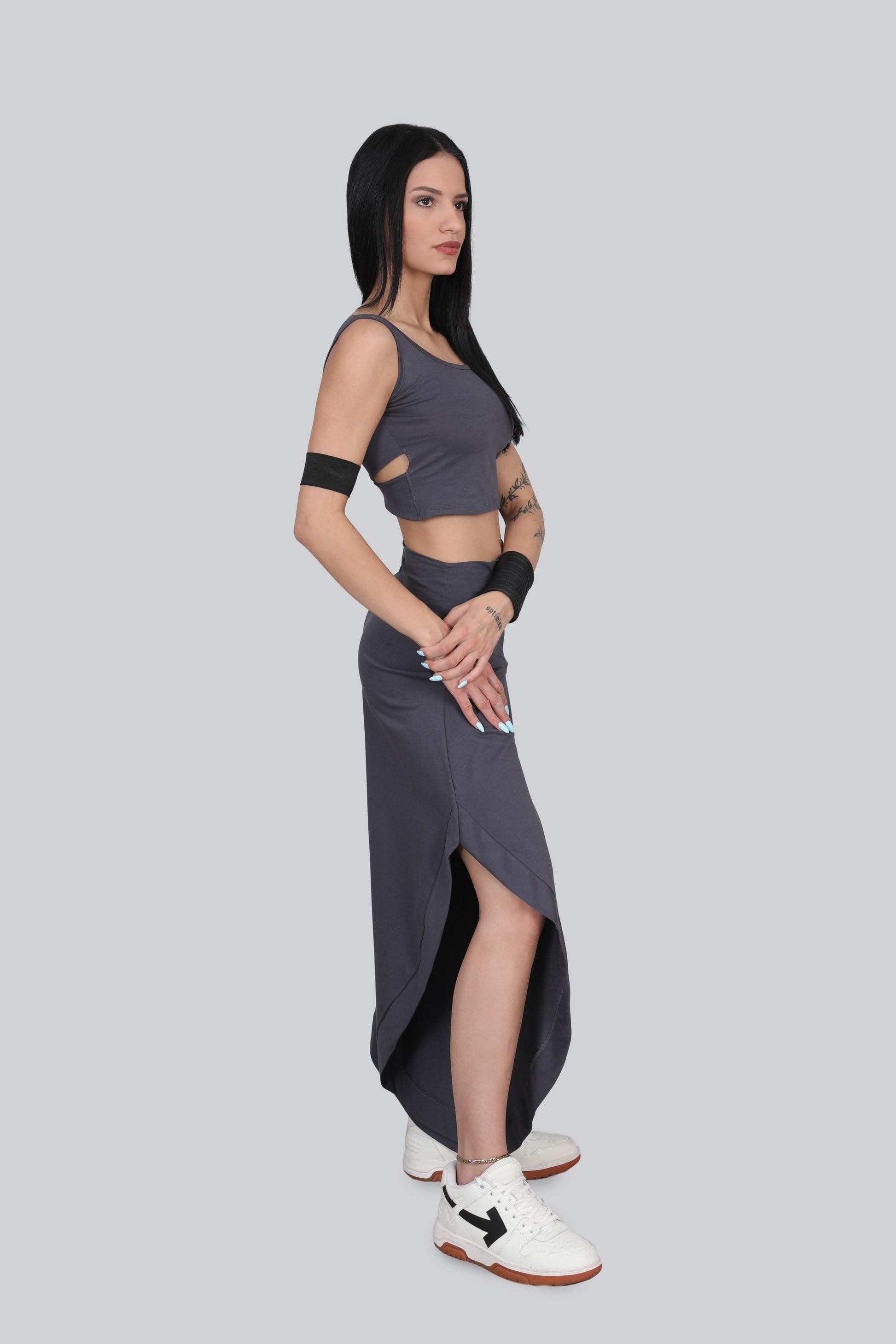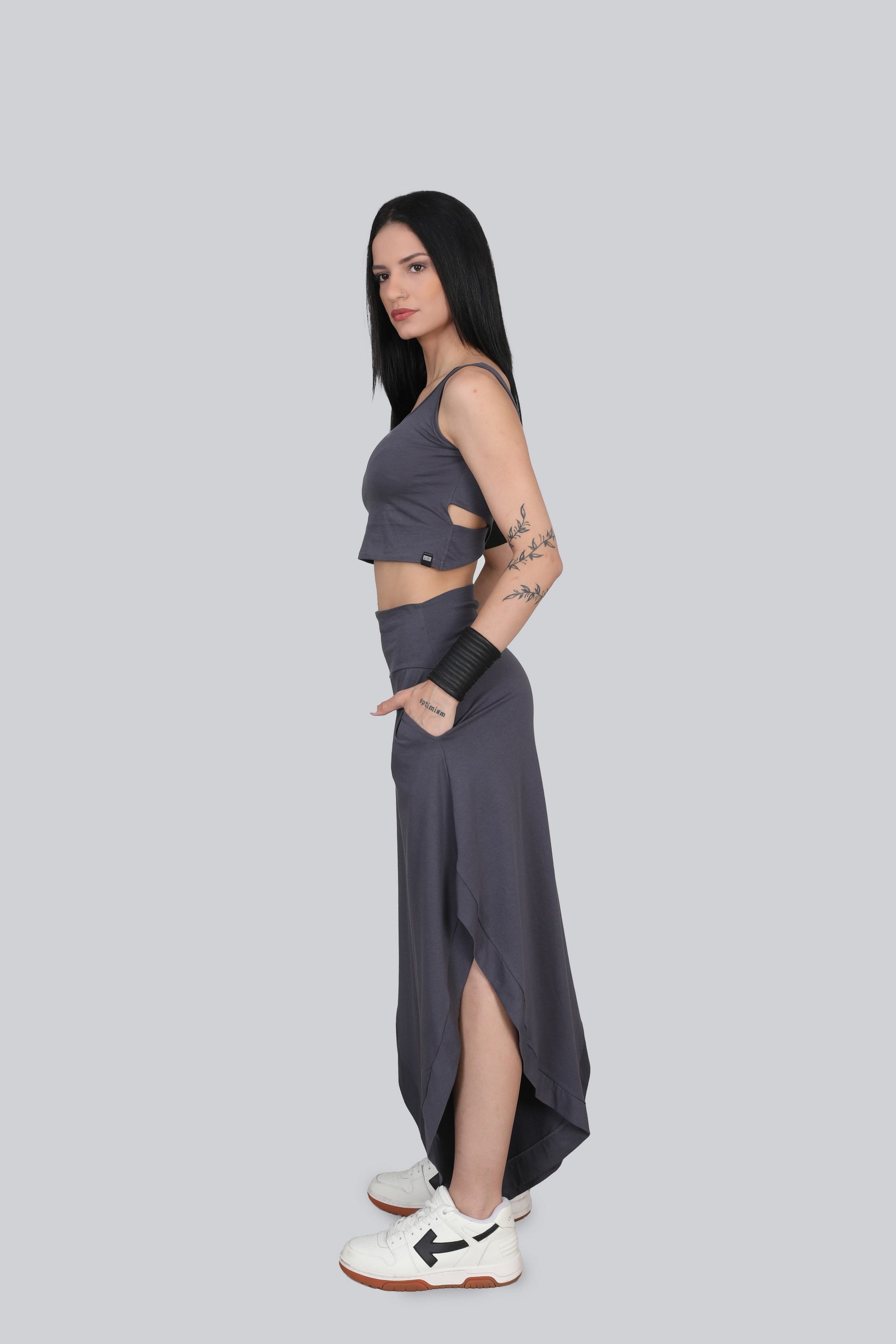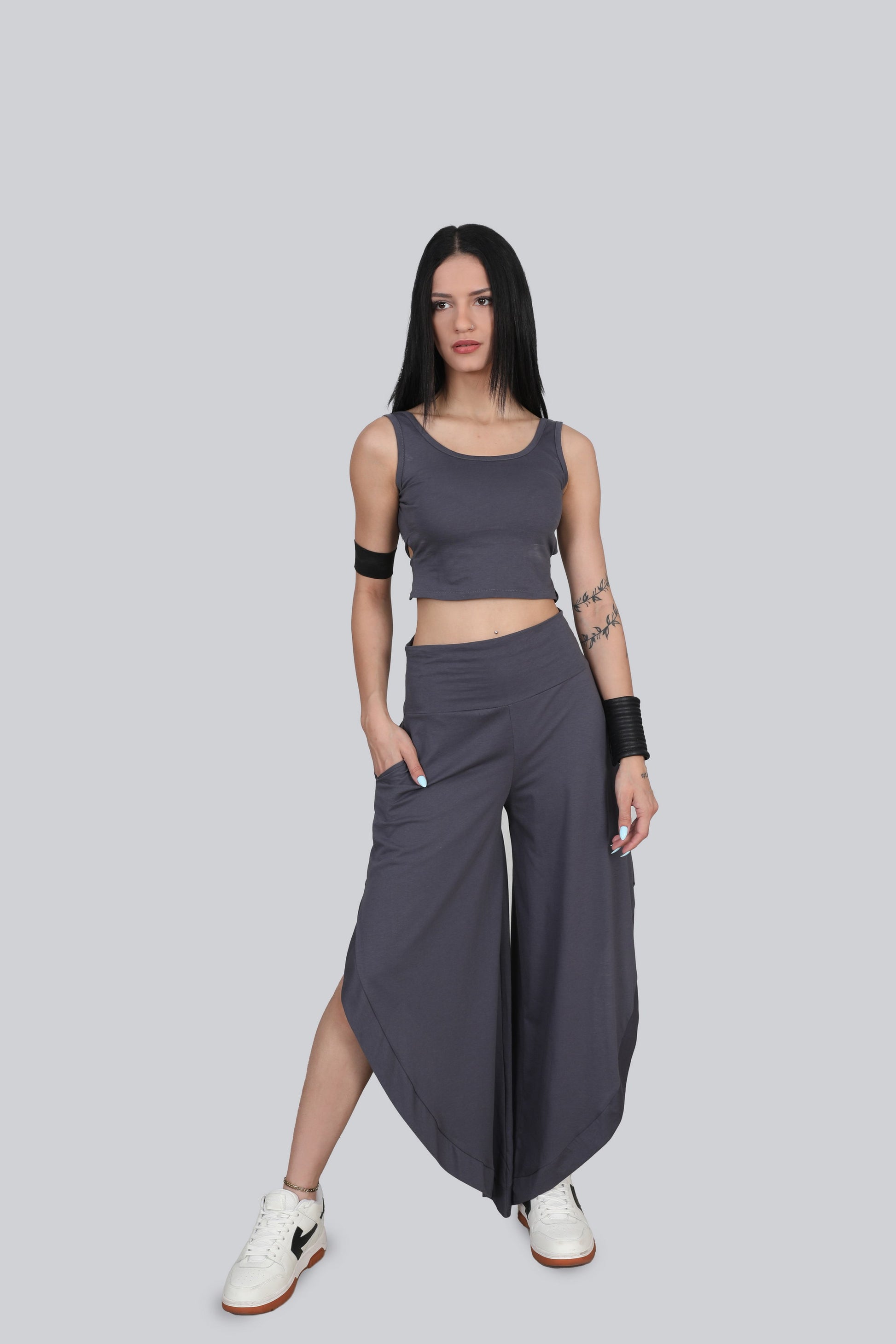 Step into effortless cool with the Edgewalker Set, designed to blur the lines between bold and comfortable. This versatile two-piece features wide-leg cotton pants with daring high side splits and deep pockets, paired with a backless, crossed-strap top that brings subtle edge to soft basics.