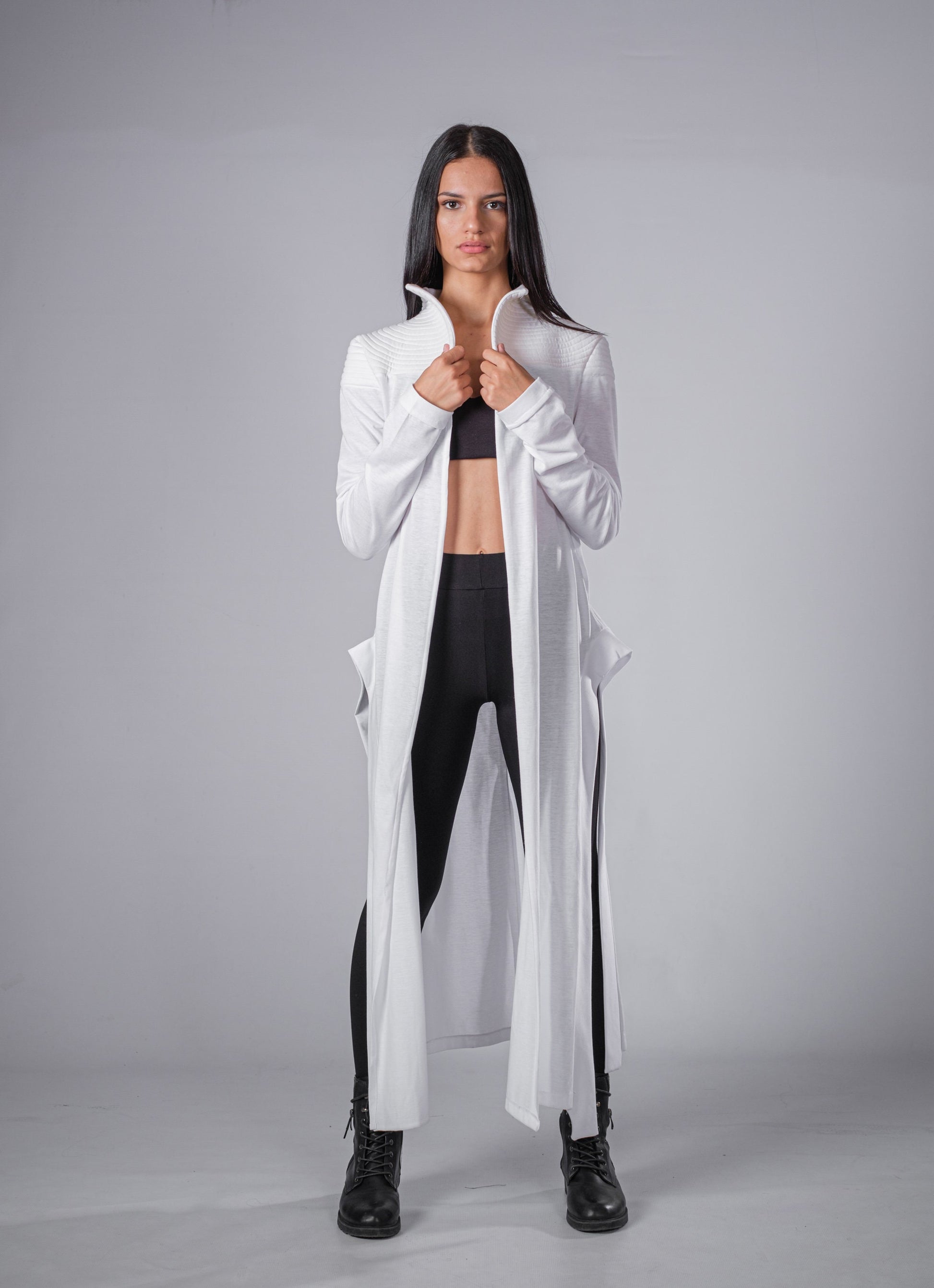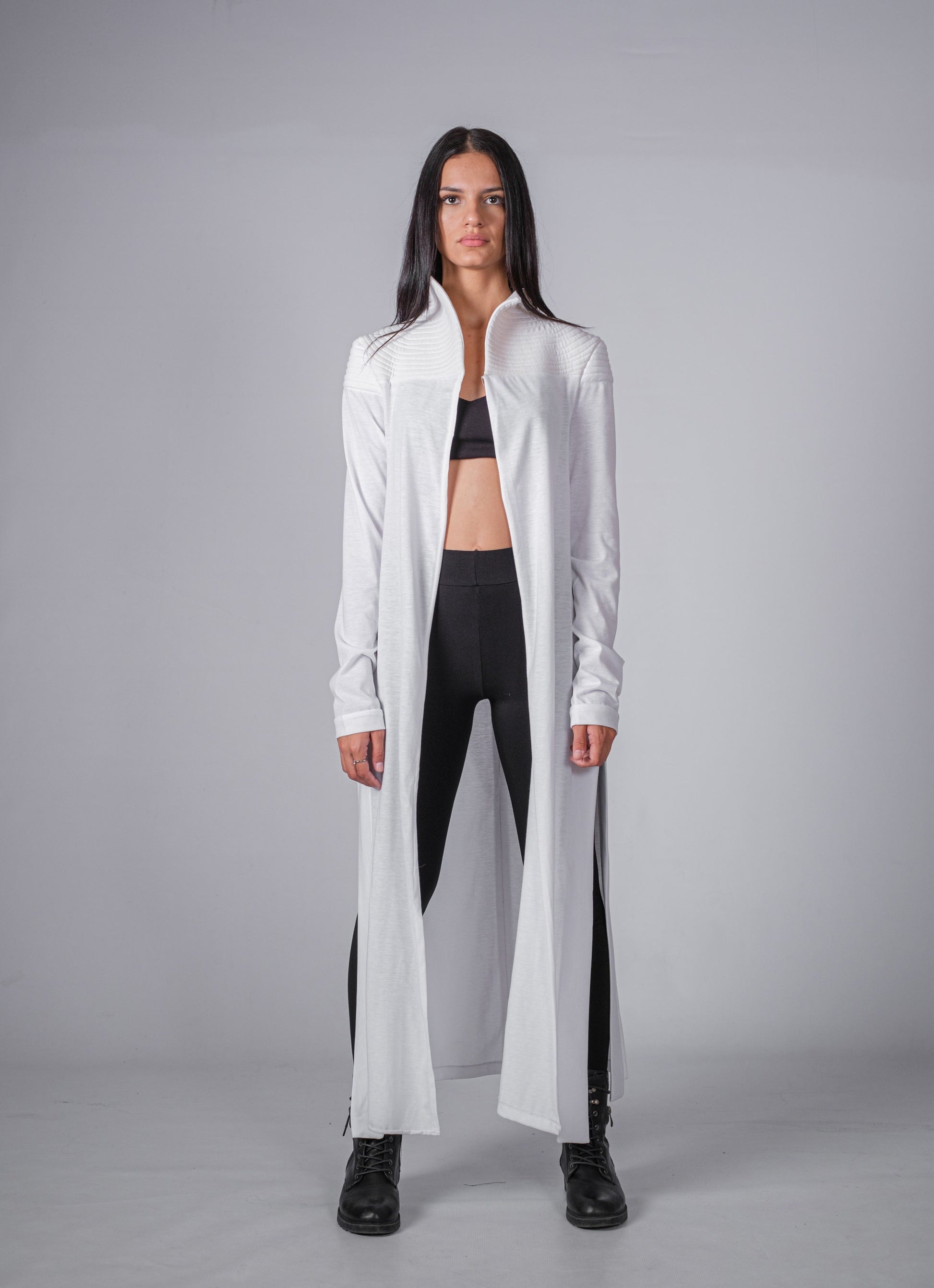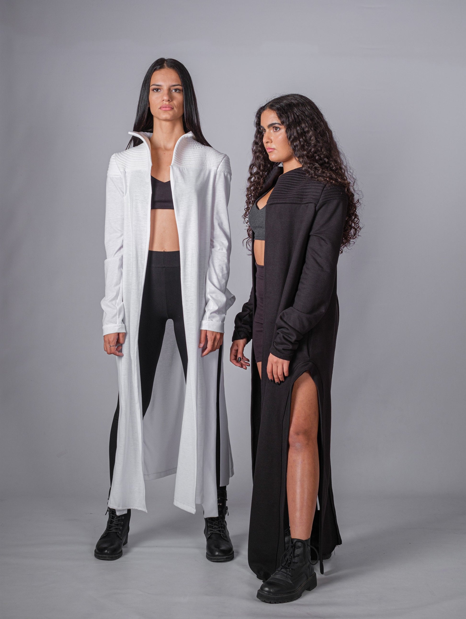 This asymmetric jacket is a true statement piece, crafted from heavy cotton for both style and comfort. The front and back are padded and stitched for added structure, and I absolutely love the padded sleeves for an extra touch of flair. Both sides are cut shorter, but the standout feature of this design is definitely the high collar—giving it an edgy, futuristic vibe while staying cozy.
