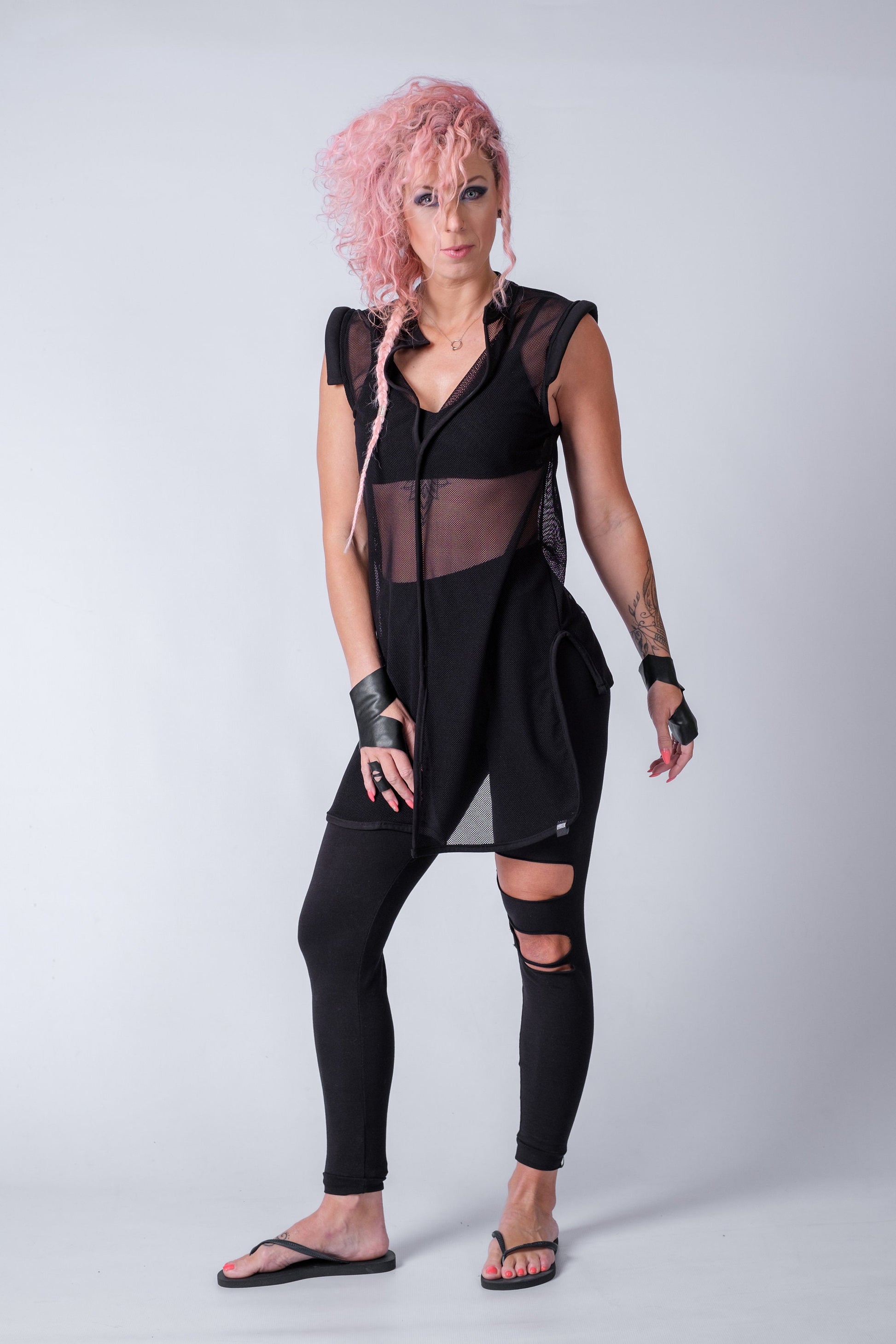 I absolutely adore the bold style this top brings! Our Asymmetric Sleeveless Top is an exciting blend of edgy and chic. Featuring padded shoulders and a high neck, this unique design offers a powerful, dynamic look that stands out. With side splits and a longer front than back, it creates an intriguing silhouette that’s anything but ordinary. Made from soft, stretchy fishnet material, this top has the texture of a shirt but with so much more personality!