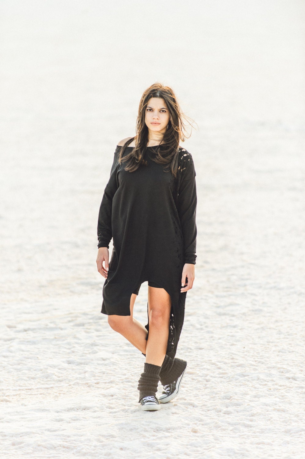 This asymmetric off-the-shoulder dress combines casual comfort with a bold, edgy twist. Featuring a wide neck and long sleeve, this piece is designed for those who love unique style. The distressed panel detail on the left side adds texture and character, while the irregular hemline brings an unexpected touch of coolness.