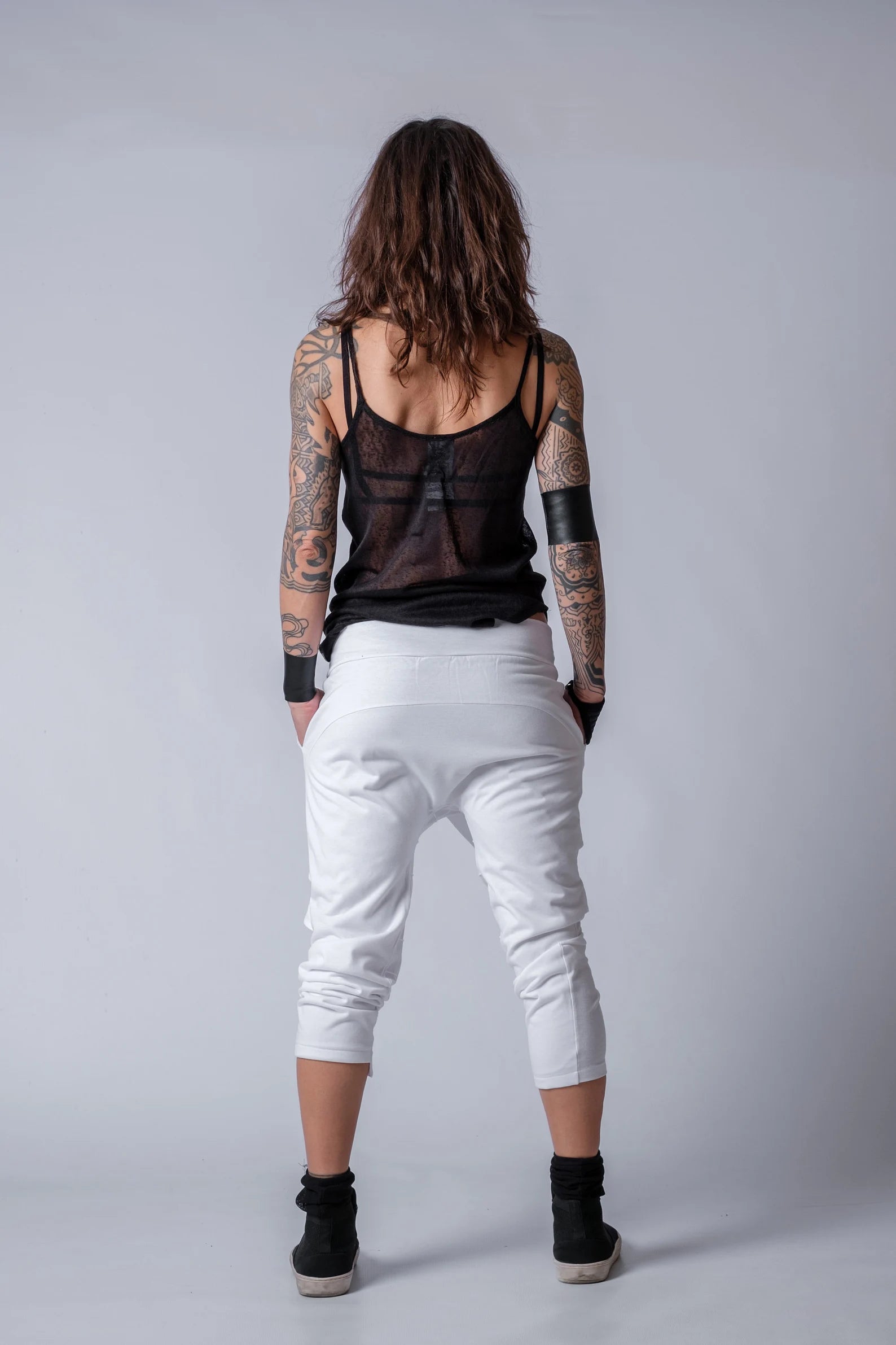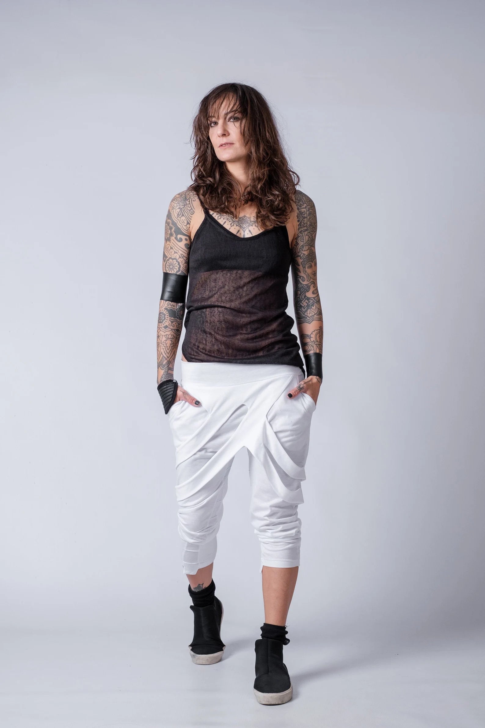 A wow design for this summer! These pants have everything you need to rock the perfect street style this year. Featuring drop crotch capri pants with a futuristic, overlayed skirt, the crotch is beautifully detailed with additional stitching that runs all the way down. Made from stretchy cotton with athletic jersey accents on the skirt, belt, and leg cuffs, this relaxed-fit design offers both comfort and edge. With pockets and a flattering back fit, these pants are perfect for pairing with a simple top for an effortlessly badass look!