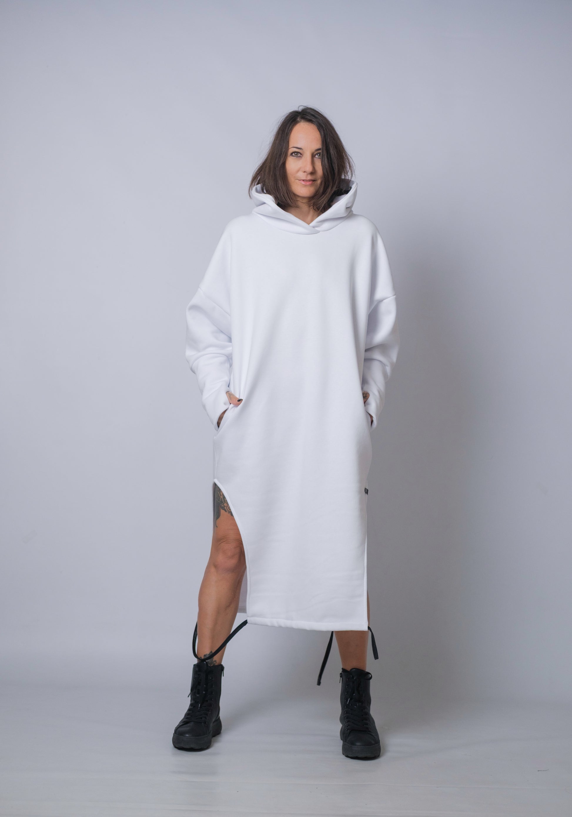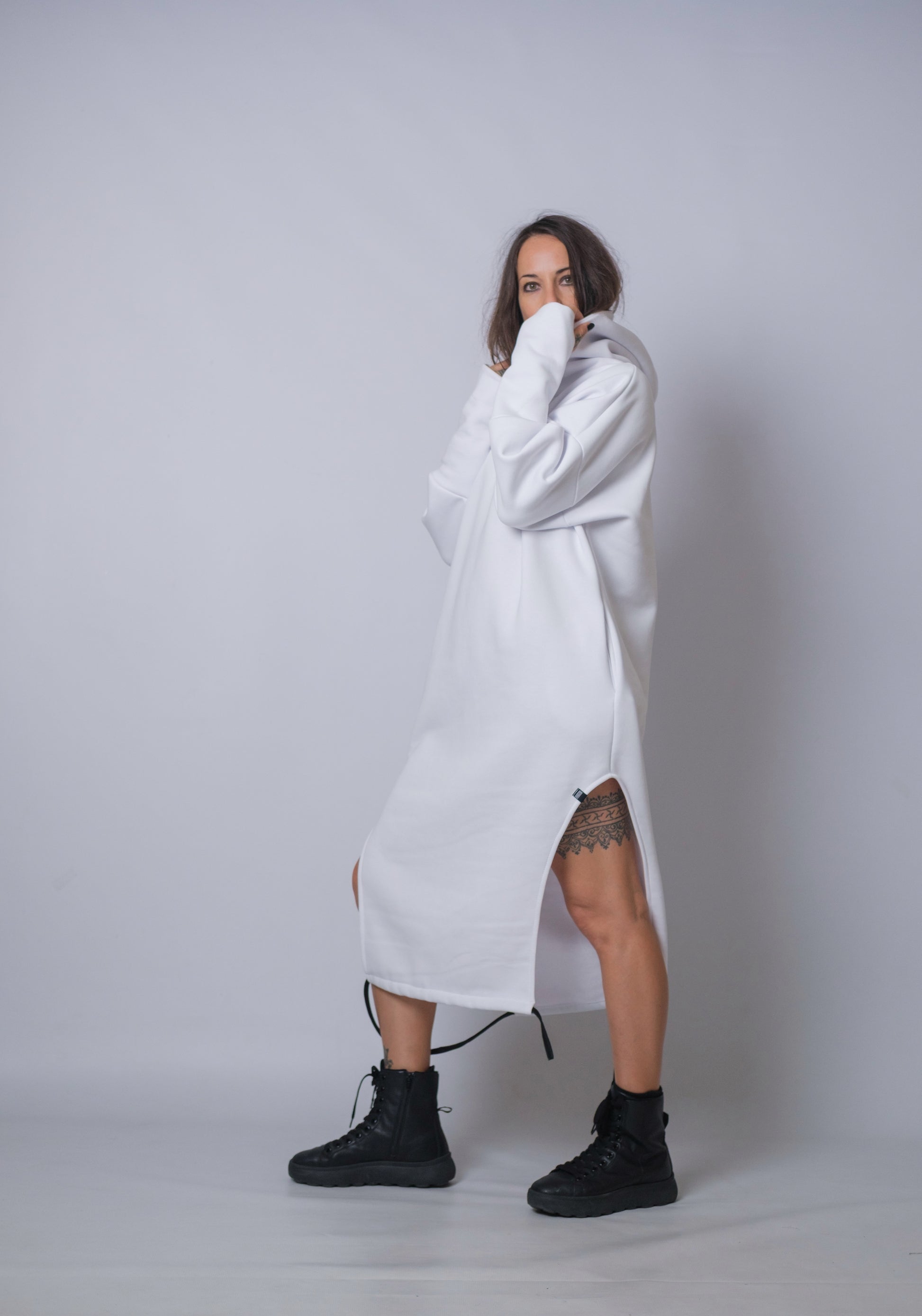 Step into effortless edge with the Dune Drift Hoodie Dress, a statement piece designed for those who like their comfort served with a side of attitude. Crafted from ultra-soft, heavyweight fabric, this oversized hoodie dress delivers cloud-level coziness while keeping its silhouette sleek and modern.
