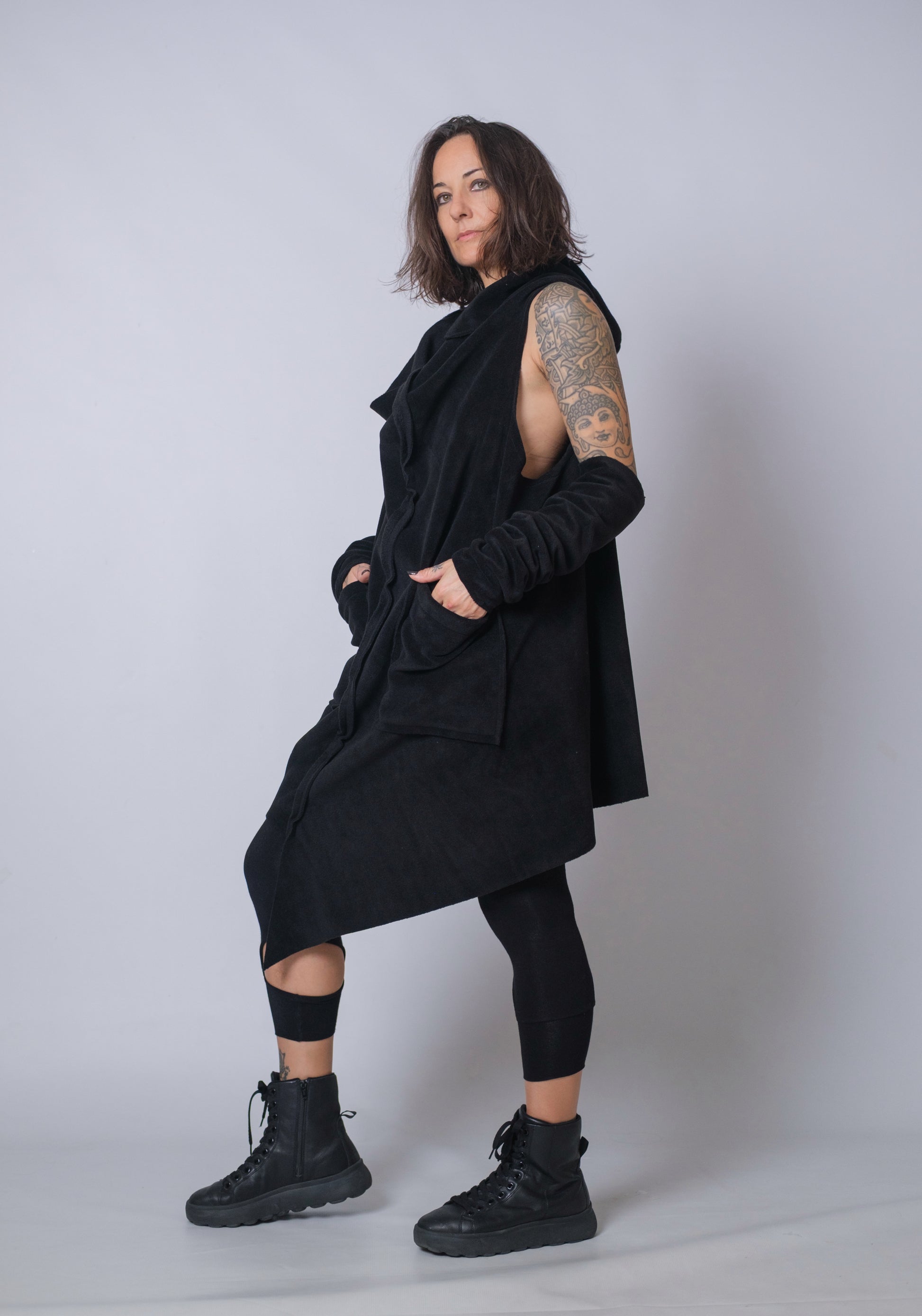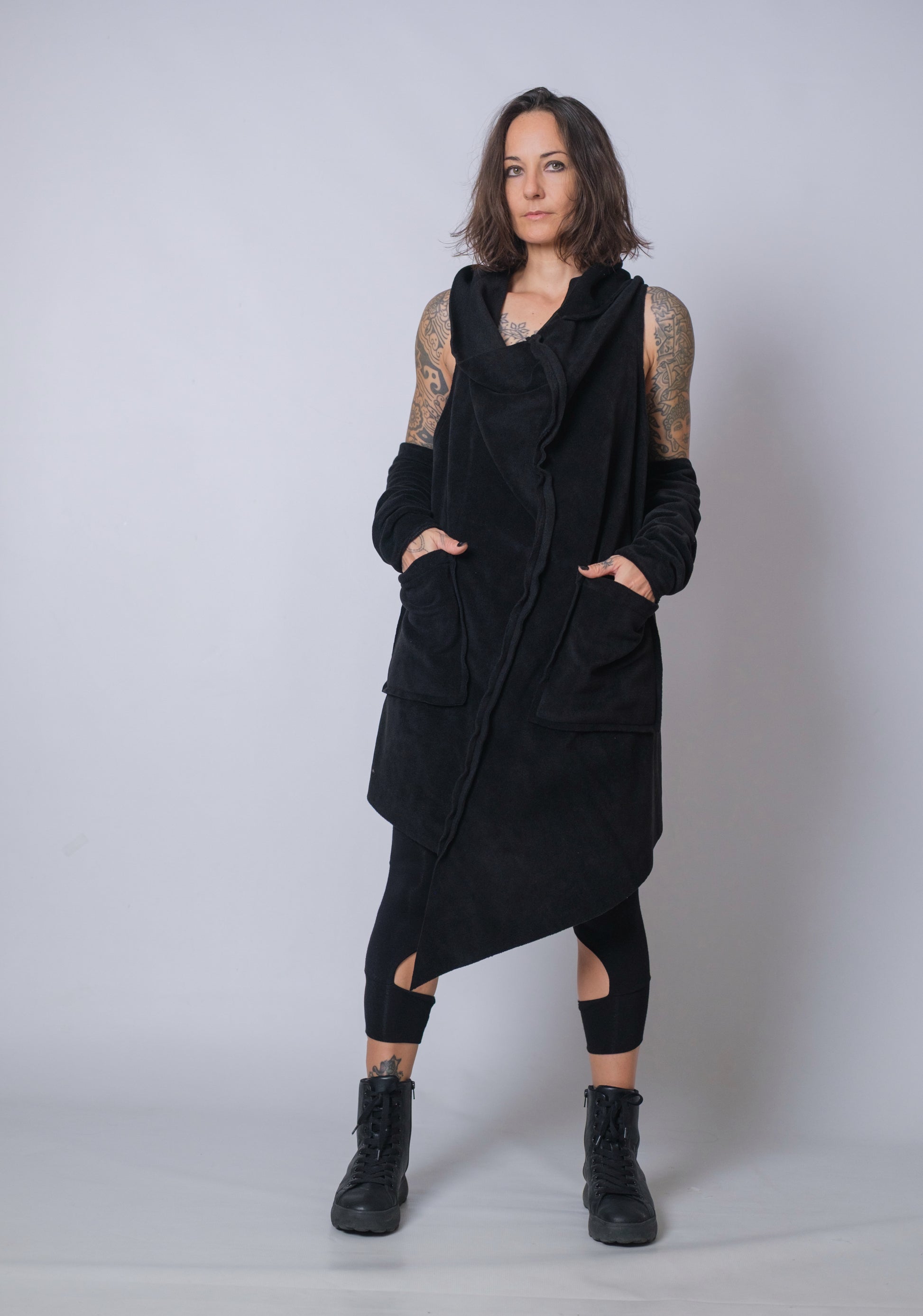 Its dramatic oversized hood sets the tone, bringing a mysterious, post-apocalyptic edge to any outfit. The asymmetric front drape adds movement and intrigue, while the roomy patch pockets keep practicality on your side. Paired with arm warmers for that extra dystopian flourish, it’s a piece that doesn’t just complete a look - it creates one.