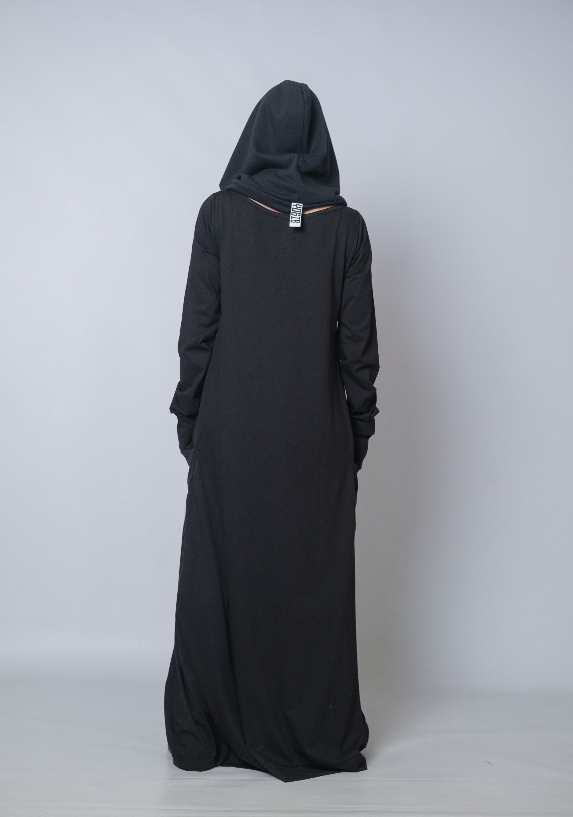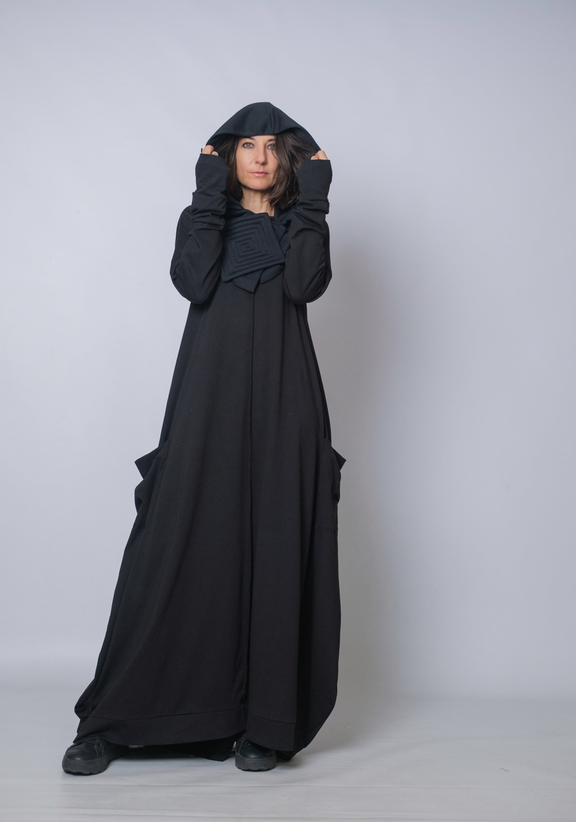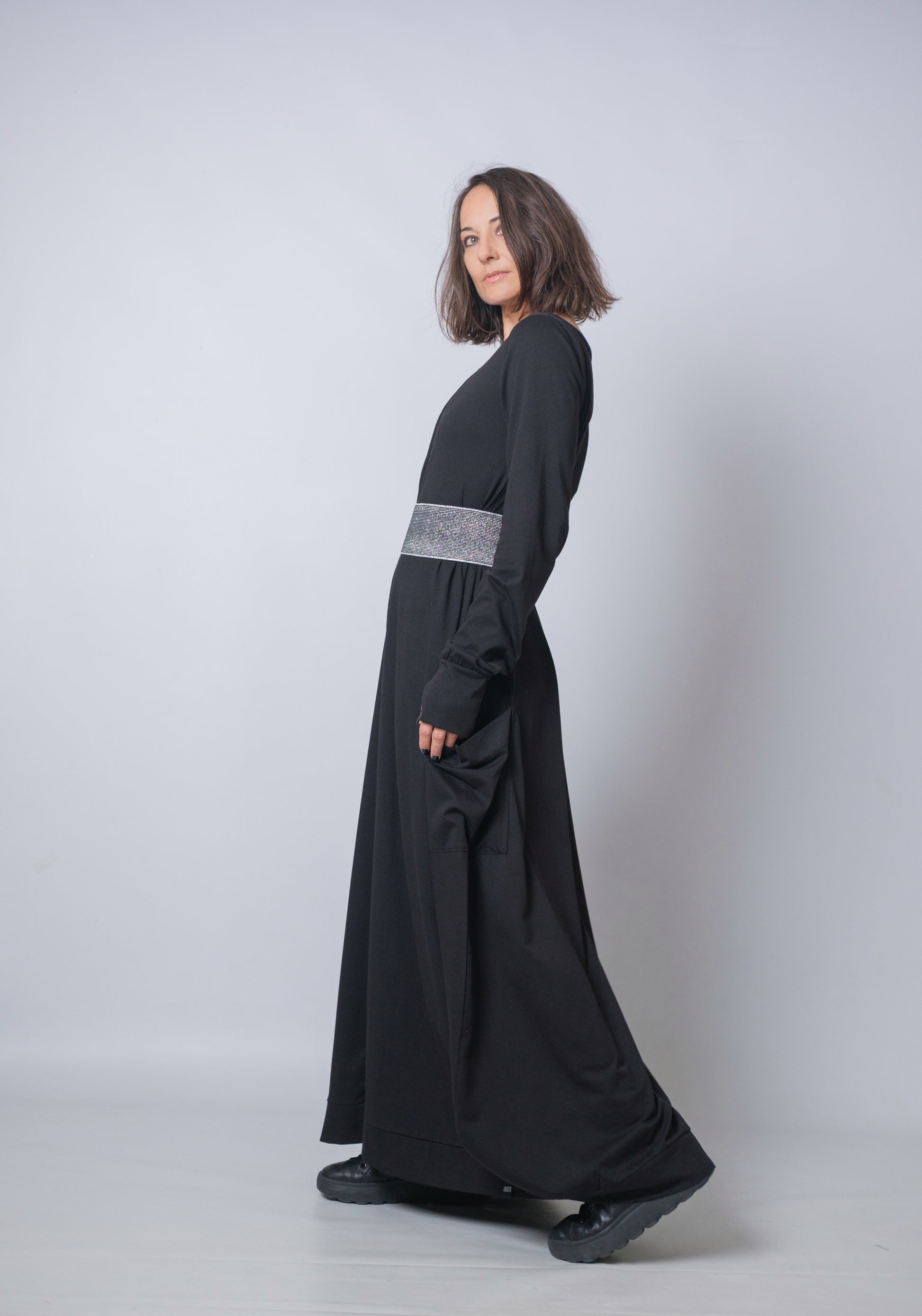 Crafted from a soft, weighty fabric that drapes with the confidence of a desert night, this full-length cloak moves beautifully with every step. Its asymmetrical neckline is crowned with sculptural, geometric detailing - subtle, but just bold enough to make people wonder if you’re secretly part of an avant-garde guild.