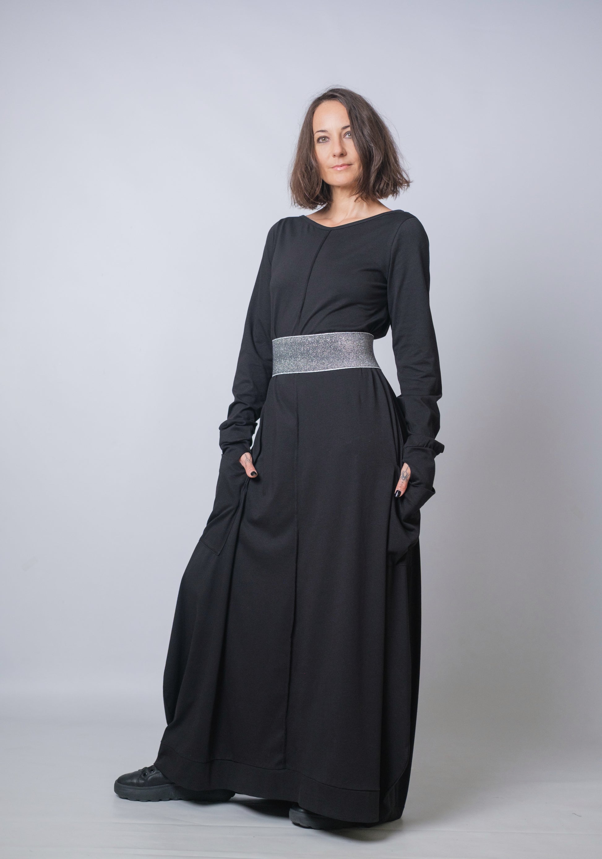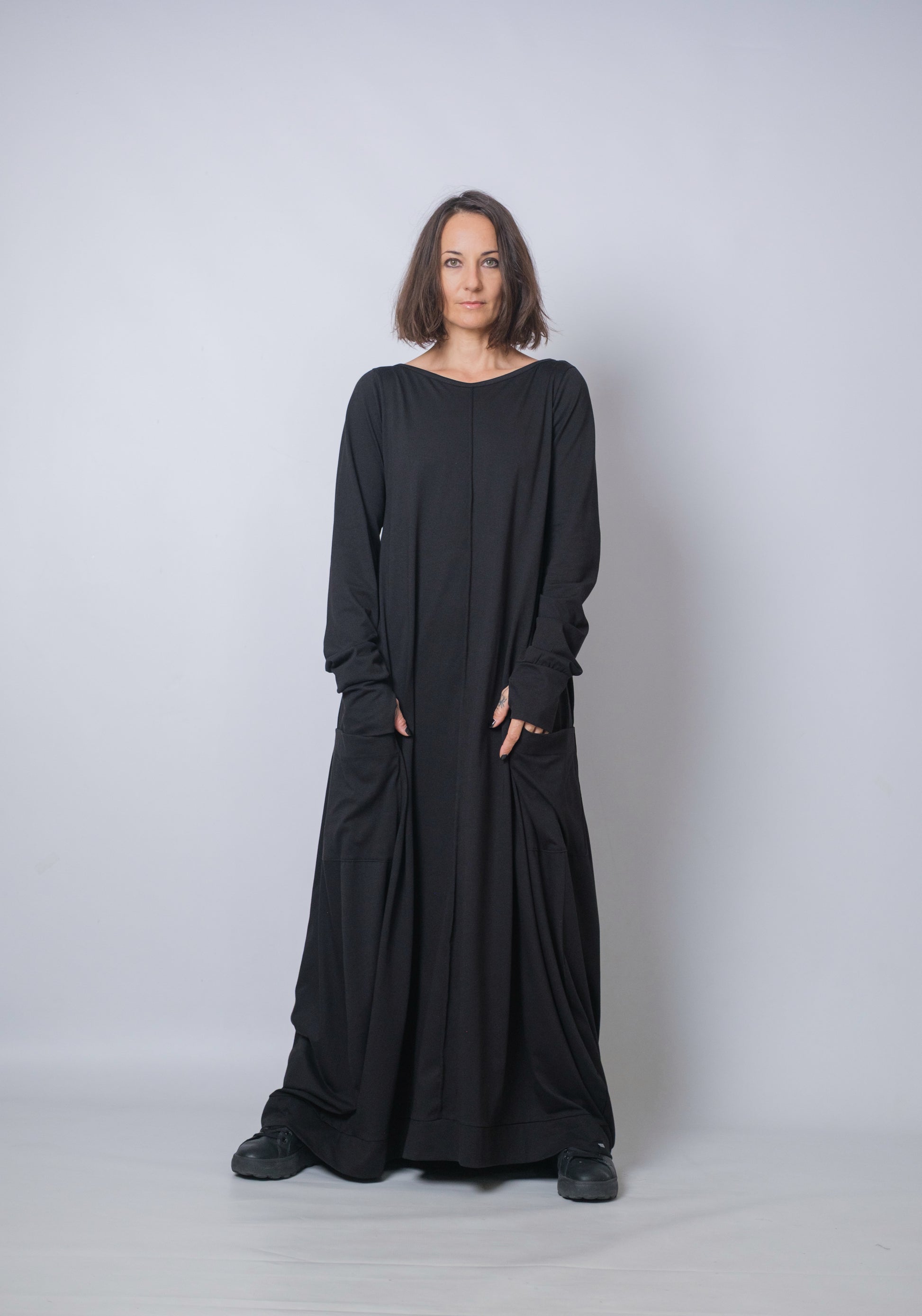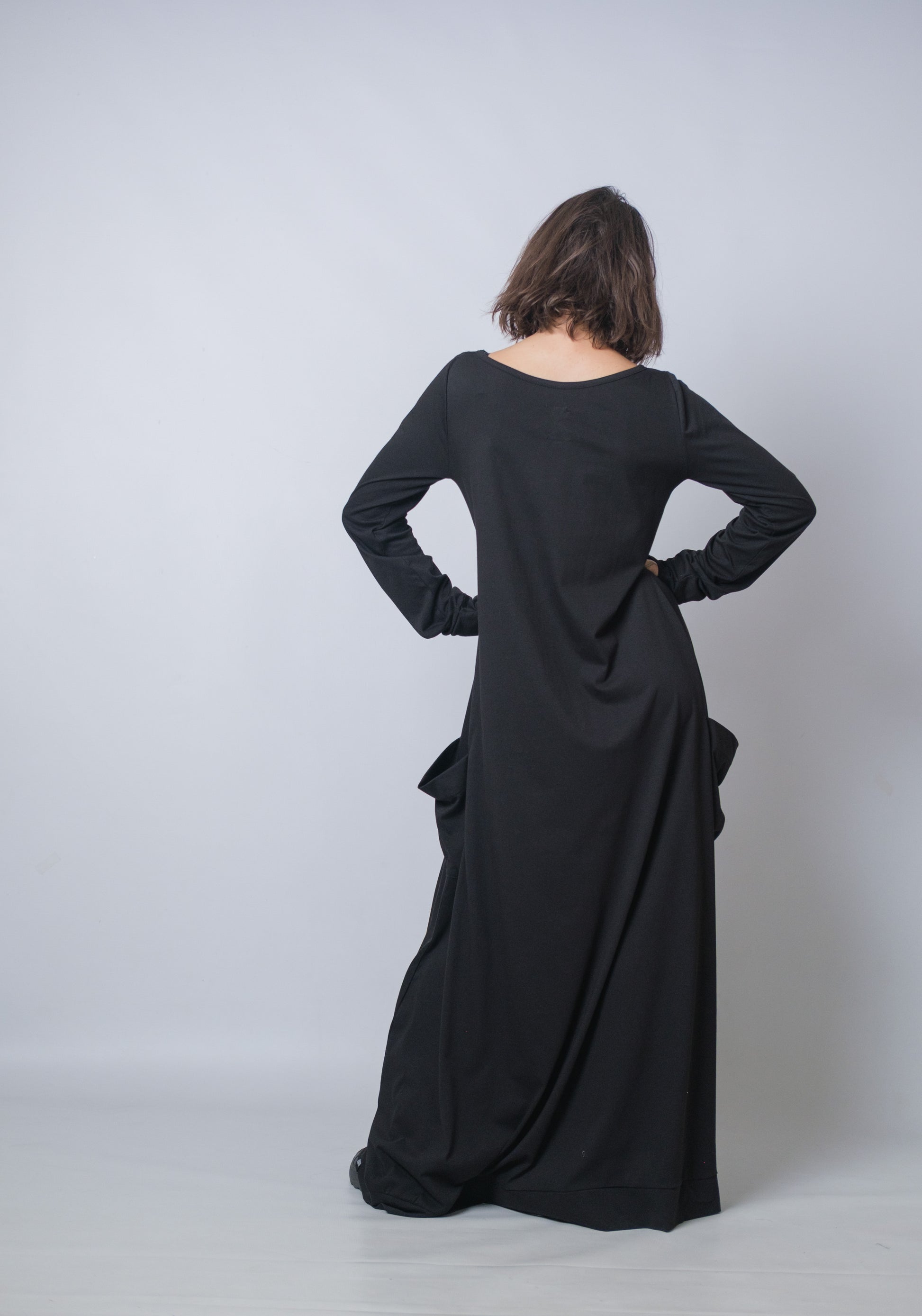 Crafted from a soft, weighty fabric that drapes with the confidence of a desert night, this full-length cloak moves beautifully with every step. Its asymmetrical neckline is crowned with sculptural, geometric detailing - subtle, but just bold enough to make people wonder if you’re secretly part of an avant-garde guild.