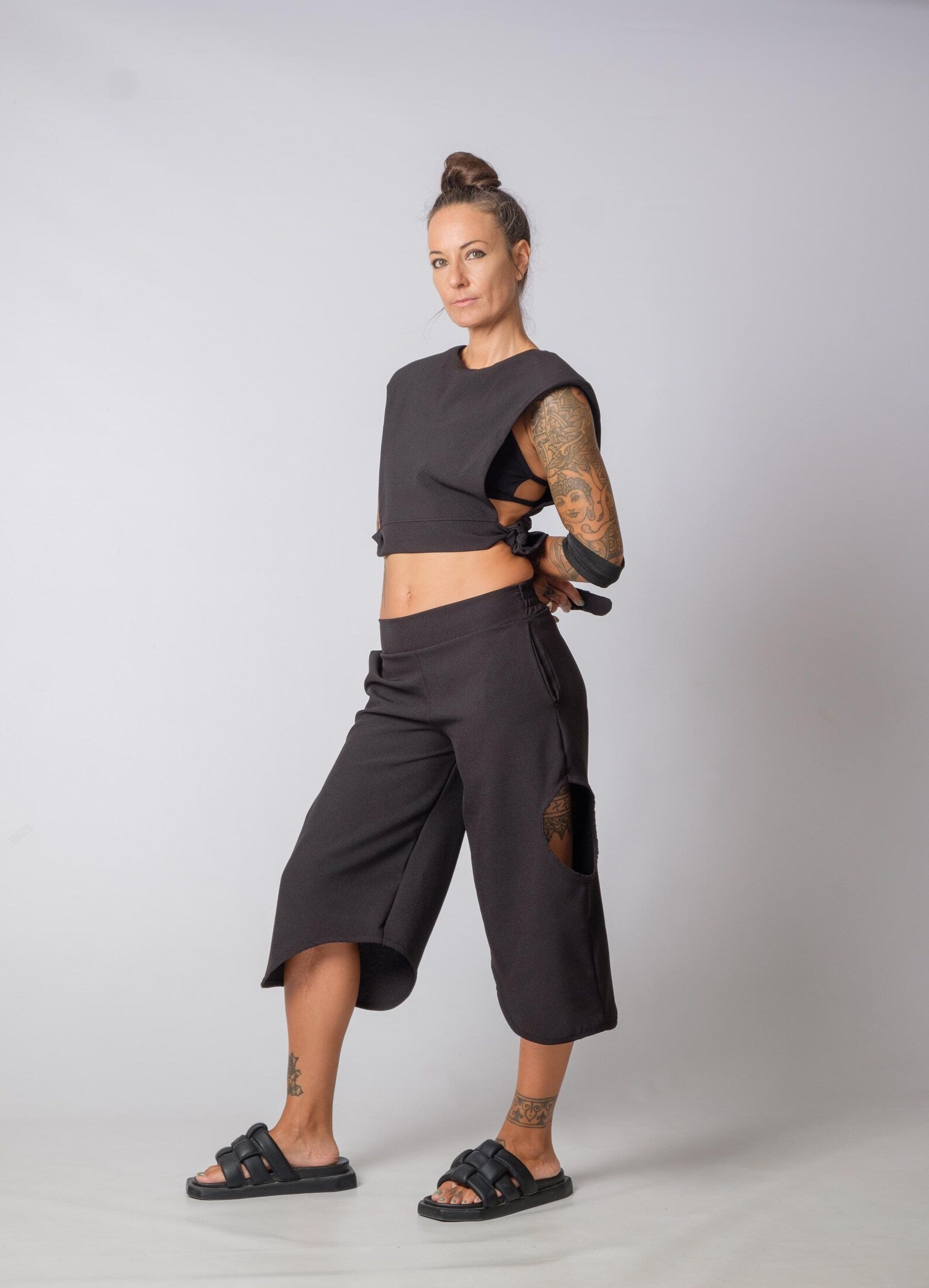 The idea for a boxy tee with shoulder pads came to me years ago, and I finally brought it to life with this design! It had to be dynamic, comfy, and versatile—a sexy day-to-night top that truly represents my brand. I absolutely love how it feels when I wear it! Made from a cotton-polyester blend, it gives me that badass yet feminine vibe. The open sides can be tied however you like, adding a unique twist to this statement piece.