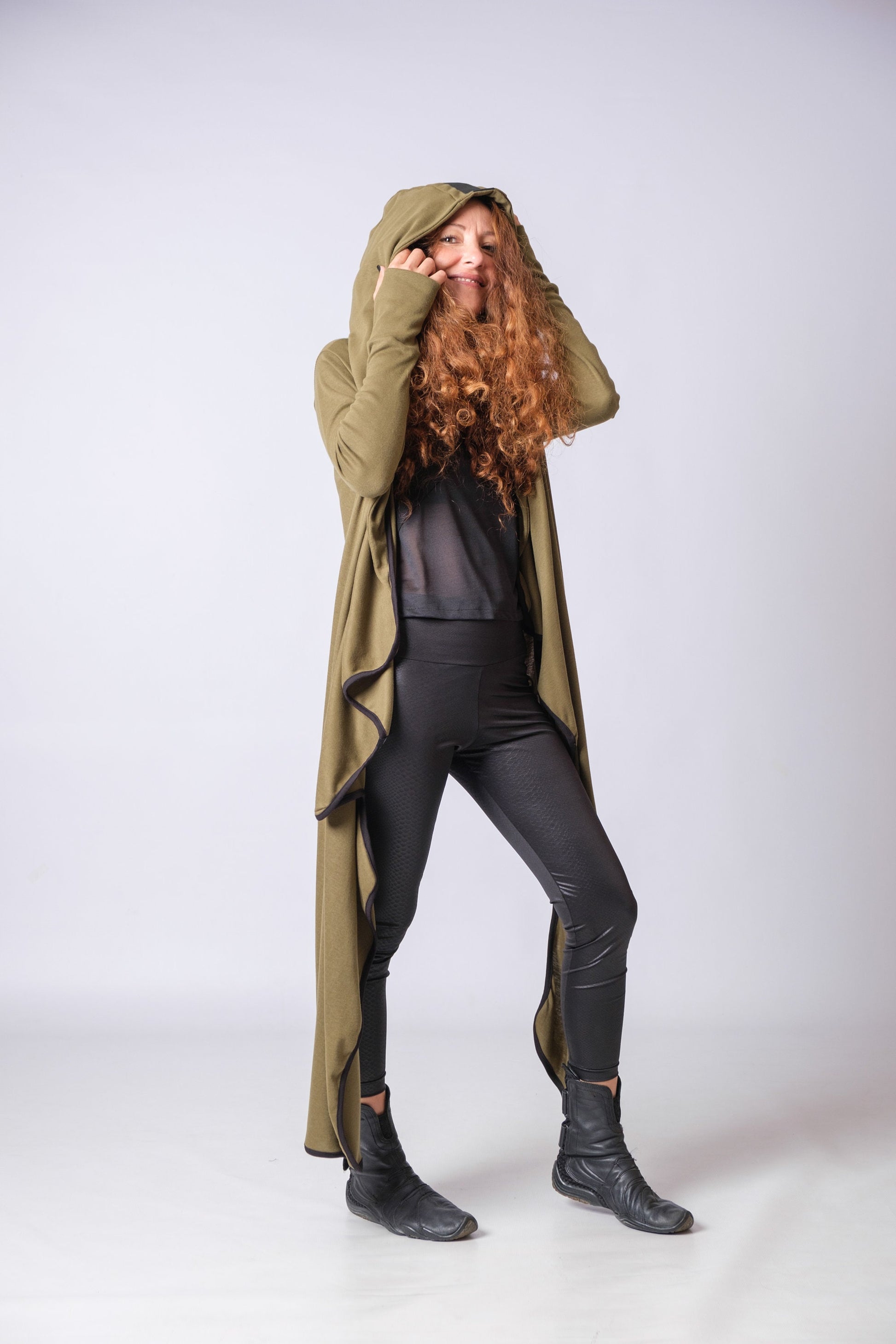 Words can’t fully capture how much I adore this design! The hood, thumb holes, and the decorated hood with black elastic add to its unique appeal. The whole cardigan is crafted with a sleek black ribbed material, creating an impressive look that draws all eyes toward you. From the rich color to the flow of the material and the dynamic style, this design is nothing short of breathtaking!