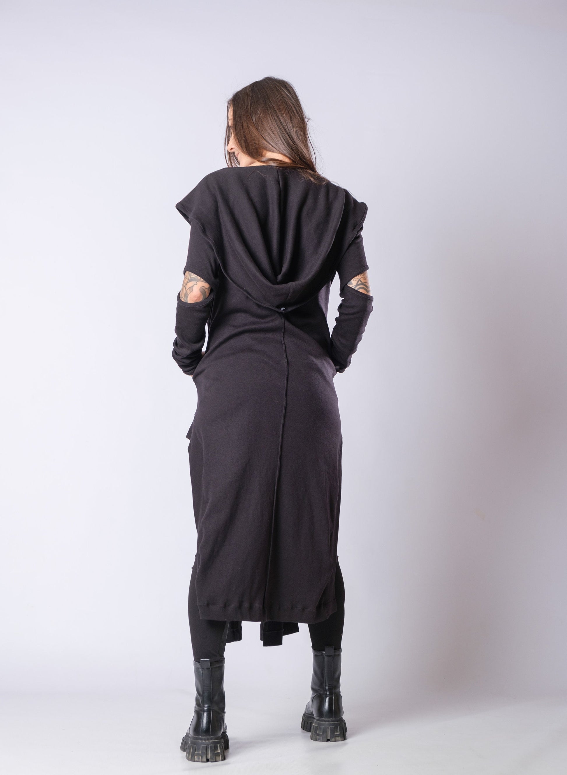 I knew I had to have this cardigan when I finished designing it, and I was absolutely right! This elegant yet dynamic piece draws all eyes to you. It’s effortless and stylish—just pair it with a plain top, leggings or tight pants, and make an entrance! The heavy cotton fabric flows beautifully, while the split sleeves and split sides give it a modern touch. The backless design adds to the allure, and the pockets and large, soft hood contribute to its mysterious, bold style.