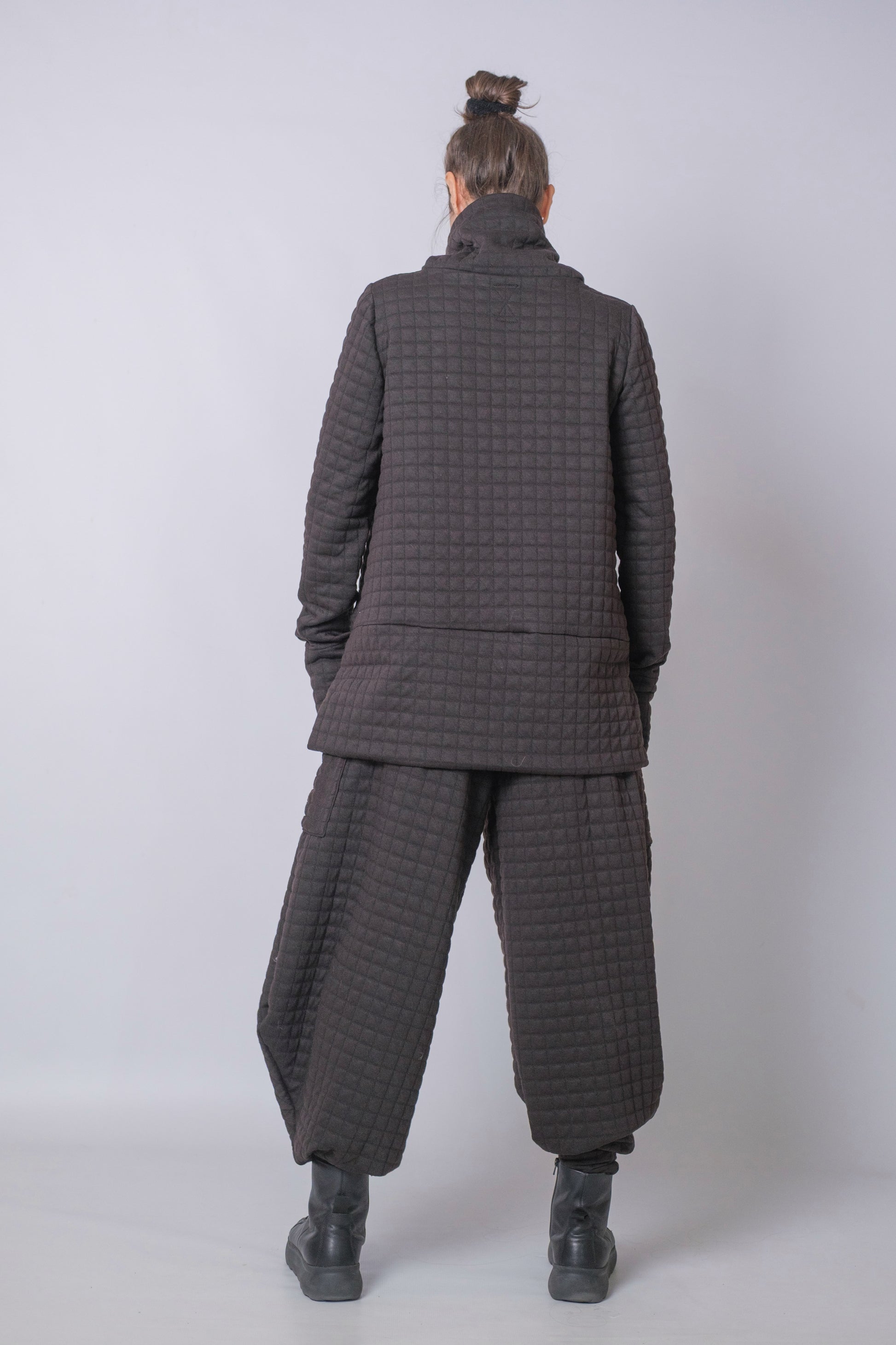 Relaxed structure meets thoughtful design. The Grid Trousers are cut from the same quilted fabric as The Grid Jacket, creating a sculptural yet effortless silhouette. The wide leg tapers slightly at the ankle, while the high, soft waistband flatters without restricting movement. Deep side pockets complete the balance of function and form.