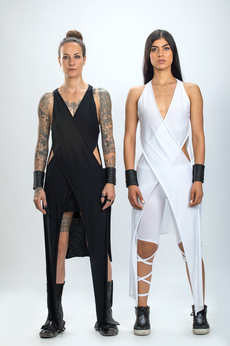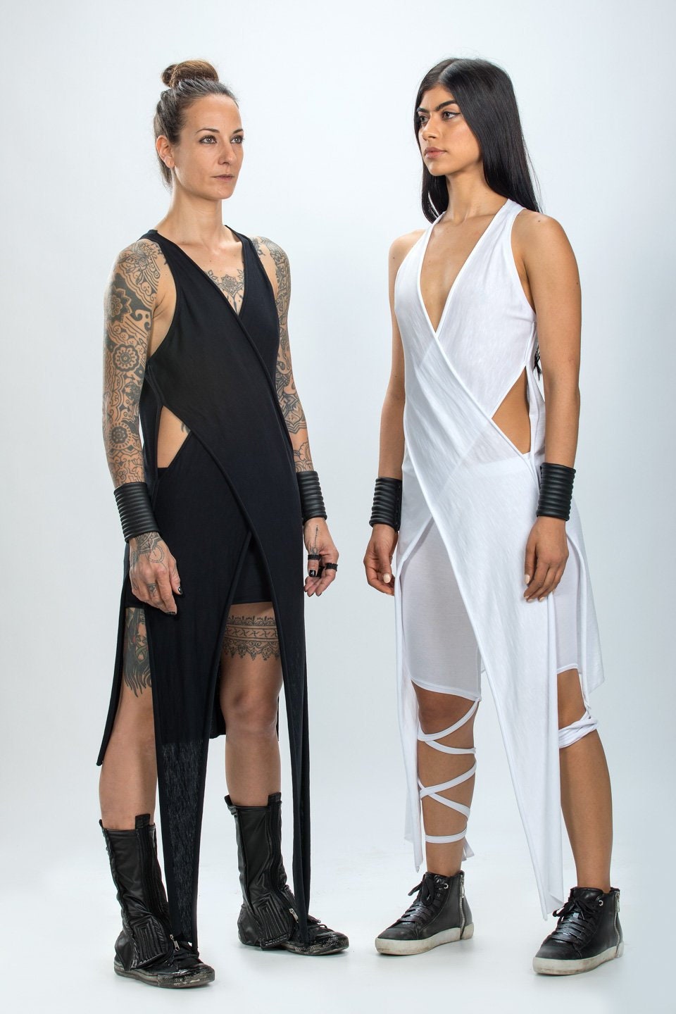 The best-seller top! Asymmetric, apocalyptic fashion! Openings at waist level, crossed at the front, deep V neckline, split at the sides and racer back. Made of cotton Lycra and inspired by Star Wars women Jedi warriors!